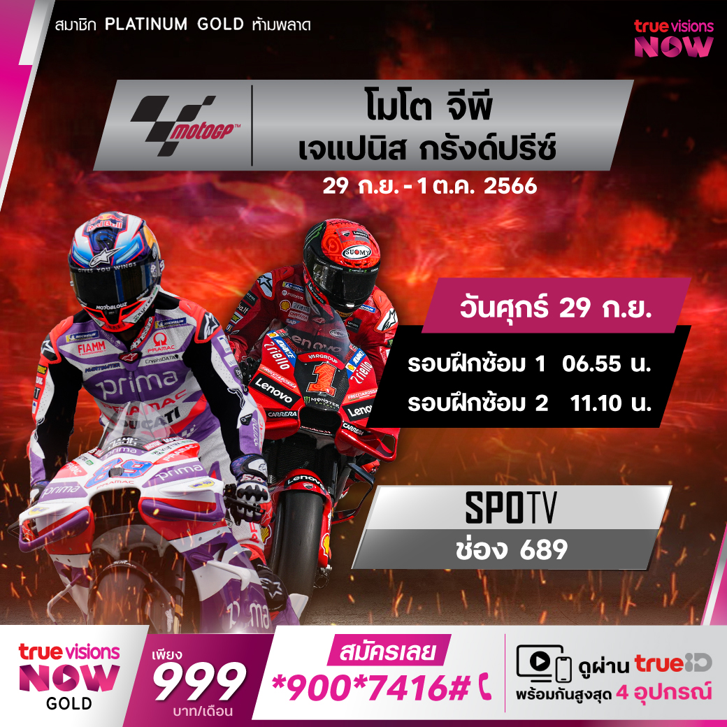 ซิ่งทะลุใส่กันสดๆ ทุกโค้ง ความดุเดือดเร้าใจ ตามสไตล์ โมโต จีพี มีให้ชมกันต่อเนื่องในฤดูกาล 2023 สัปดาห์นี้ ไปกันที่แดนอาทิตย์อุทัย กับสนามที่ 14 รายการ เจแปนิส กรังด์ปรีซ์ จากสนาม โมเตกิ เซอร์กิต เชียร์กันสนุกทั้งรุ่น โมโต 3, โมโต 2 และโมโต จีพี ทุกช่วงสำคัญ ทุกเรซ ใครจะเป็นแชมป์ตามติดชิดขอบแทร็ค ชมสด ทาง ทรูวิชั่นส์