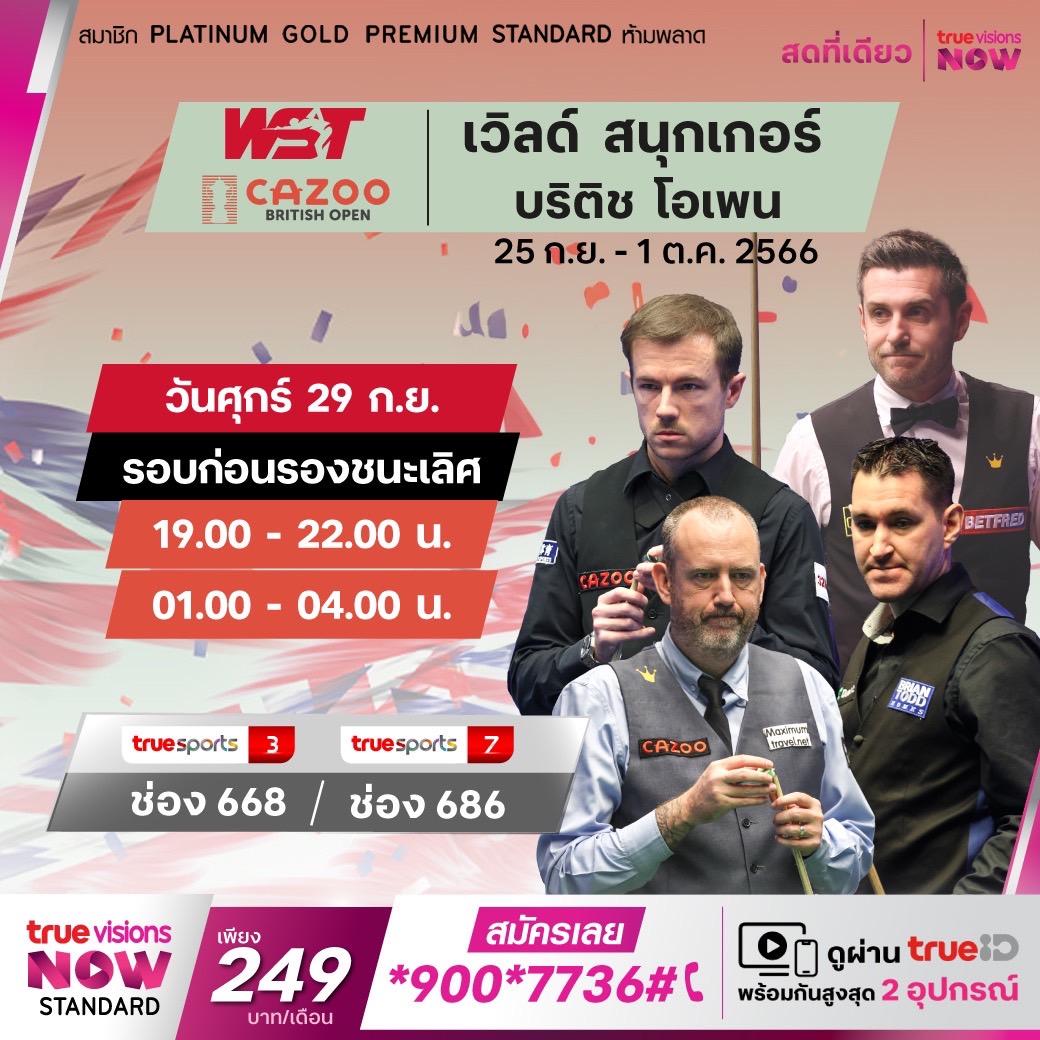 ศึกสอยคิวระดับโลกสัปดาห์นี้แฟนๆ จะได้ชมเหล่าบรรดาตัวเทพของวงการ ลุ้นเป็นแชมป์รายการเก็บคะแนนสะสมโลก บริติช โอเพ่น 2023 จากสังเวียน เซนทัวร์ อารีน่า เฟรมต่อเฟรม รอบต่อรอบ ใครจะได้ชูโทรฟี่เมื่อจบรอบชิงชนะเลิศ สด เอ็กซ์คลูซีฟ ที่ ทรูวิชั่นส์