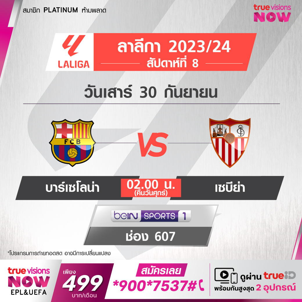 Barcelona vs Sevilla เวลา 02.00-04.00 ทางช่อง beIN 1 (607)