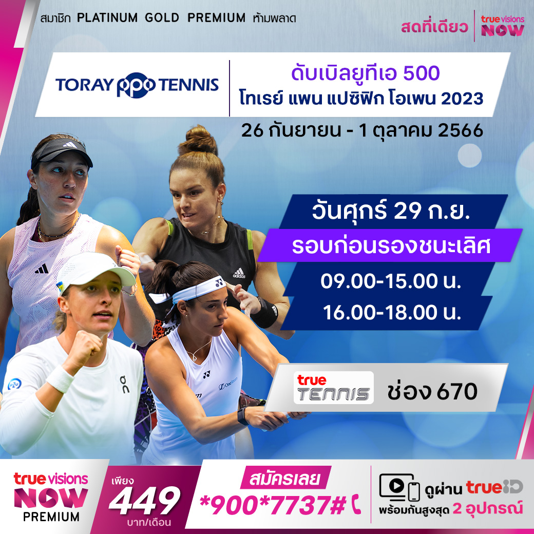 เทนนิส ดับเบิ้ลยูทีเอ ทัวร์ สัปดาห์นี้ติดตามการดวลแร็คเก็ตที่ประเทศญี่ปุ่น กับรายการสุดคลาสสิก โทเรย์ แพน แปซิฟิก โอเพ่น เทนนิส 2023 ในรอบก่อนรองชนะเลิศ สด เอ็กซ์คลูซีฟ จากกรุงโตเกียวครบทุกรอบ ทาง ทรูวิชั่นส์ ที่เดียว
