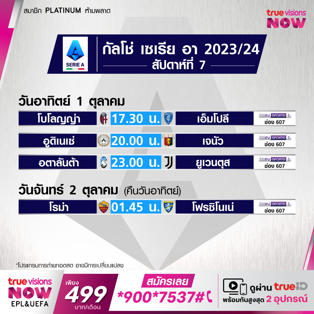วันนี้มีอะไรดูที่ ทรูวิชั่นส์ ประจำวันอาทิตย์ที่ 1 ตุลาคม 66 ในส่วนของฟุตบอลยังจัดเต็มด้วยศึกพรีเมียร์ลีก อังกฤษ, กัลโช่ เซเรีย อา อิตาลี, บุนเดสลีกา เยอรมนี, ลา ลีกา สเปน และ ลีก เอิง ฝรั่งเศส ให้ได้ตามเชียร์กันต่อเนื่อง ส่วนกีฬาอื่นๆ ยังมีศึกโมโต จีพี สนามที่ 14 รายการ เจแปนิส กรังด์ ปรีซ์ เทนนิส, เทนนิส เอทีพี ทัวร์ และ ดับเบิ้ลยูทีเอ ทัวร์ รายการ ไชน่า โอเพ่น, ดับเบิ้ลยูทีเอ ทัวร์ รายการ แพน แปซิฟิก โอเพ่น, กอล์ฟประเภททีมที่ยิ่งใหญ่ที่สุด ไรเดอร์ คัพ, แอลพีจีเอ ทัวร์ รายการ อาร์คันซอ แชมเปี้ยนชิพ, เวิลด์ สนุกเกอร์ รายการใหญ่อย่าง บริติช โอเพ่น และศึกอเมริกันฟุตบอลเอ็นเอฟแอล งานนี้ ทรูวิชั่นส์ จัดเต็มให้ชมกันถึงบ้าน