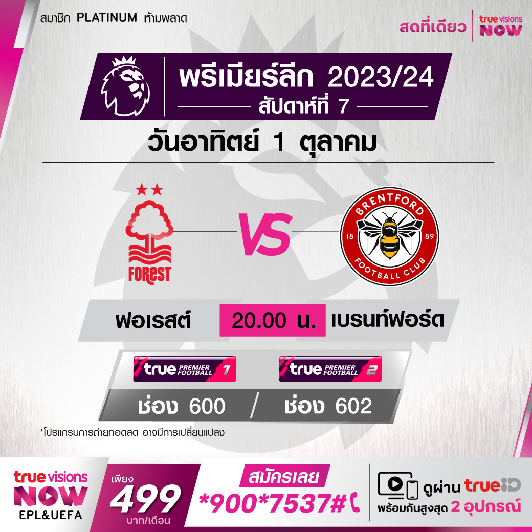 Nottingham Forest vs Brentford เวลา 20:00 - 22:00 TPF 1(600) / TPF 2 (602)