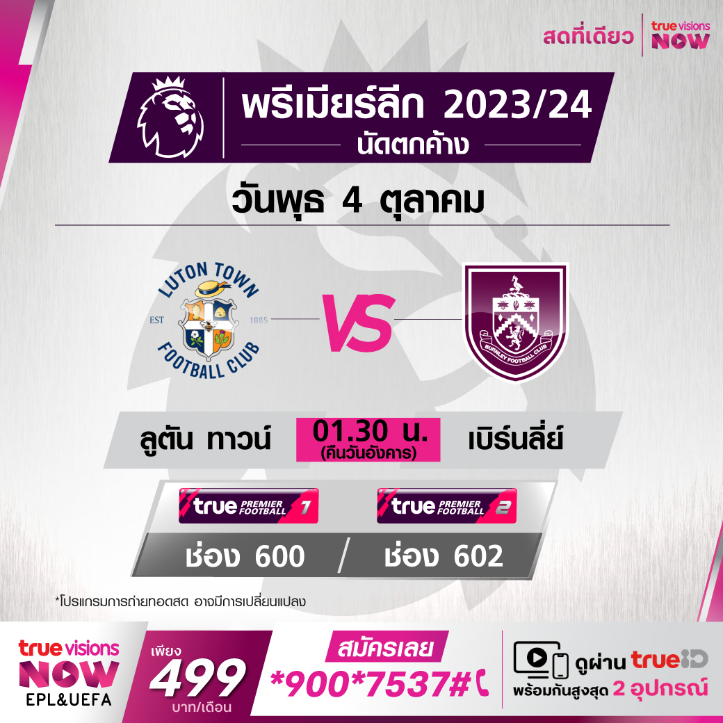 Luton Town vs Burnley เวลา 01:30 - 03:30 ทางช่อง TPF 1(600) / TPF 2 (602)