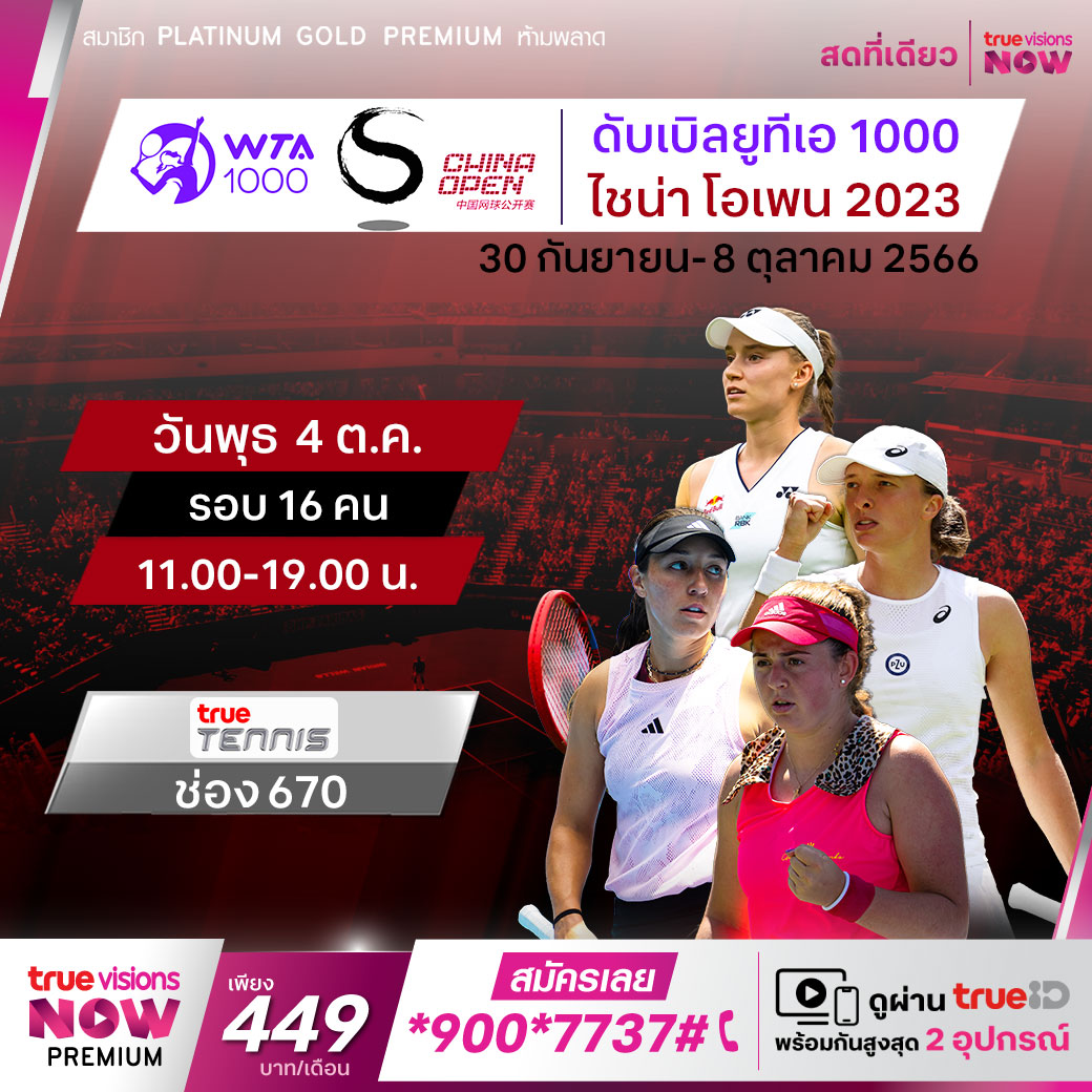 เทนนิสหญิง ดับเบิ้ลยูทีเอ ทัวร์ ไชน่า โอเพ่น 2023 ความมันส์ระดับ 1000 ซีรี่ส์ เชียร์มือท็อปของโลกกันแบบแต้มต่อแต้ม เกมต่อเกม รอบต่อรอบ ทุกชัยชนะ มีความหมายต่อการเป็นผู้ชนะเลิศรายการนี้ สด เอ็กซ์คลูซีฟ ชมสด ทาง ทรูวิชั่นส์ ที่เดียวรอบ 16 คน เวลา 11.00 - 19.00 ทางช่อง True Tennis (670)