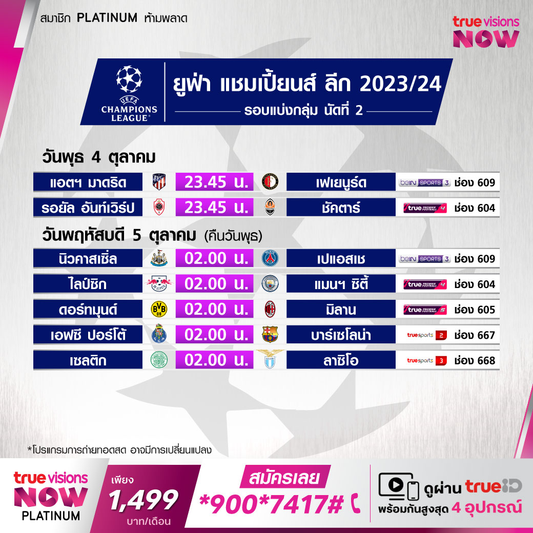 วันนี้มีอะไรดูที่ ทรูวิชั่นส์ ประจำวันพุธที่ 4 ตุลาคม 66 ในส่วนของฟุตบอลยังมีศึกยูฟ่า แชมเปี้ยนส์ ลีก และ เอเอฟซี แชมเปี้ยนส์ ลีก ให้ได้ตามเชียร์กันต่อ ส่วนกีฬาอื่นๆ ยังมีศึกเทนนิส เอทีพี ทัวร์ และ ดับเบิ้ลยูทีเอ ทัวร์ รายการ ไชน่า โอเพ่น, เอทีพี ทัวร์ รายการ เซี่ยงไฮ้ มาสเตอร์ส และ เวิลด์ สนุกเกอร์ รายการใหญ่อย่าง อิงลิช โอเพ่น งานนี้ ทรูวิชั่นส์ จัดเต็มให้ชมกันถึงบ้าน