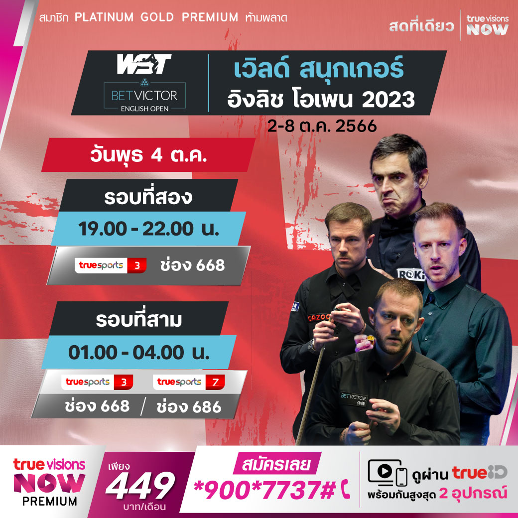 ศึกเวิลด์ สนุกเกอร์ รายการเก็บคะแนนสะสมโลก สัปดาห์ที่ 2 ติดต่อกันในประเทศอังกฤษ กับรายการ อิงลิช โอเพ่น 2023 ที่เป็นรายการแรกของ โฮม เนชั่นส์ ซีรีส์ สด เอ็กซ์คลูซีฟ จากเบรนท์วู้ด ประเทศอังกฤษ ชมสด ทาง ทรูวิชั่นส์ ที่เดียวรอบที่สอง เวลา 19.00 - 22.00 TS 3 (668)
