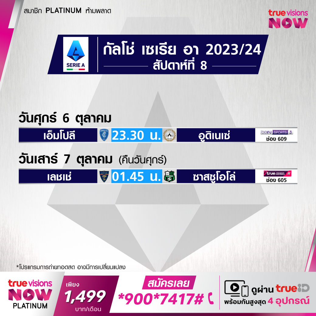 Empoli vs Udinese เวลา 23.30-01.30 ทางช่อง beIN 3 (609)