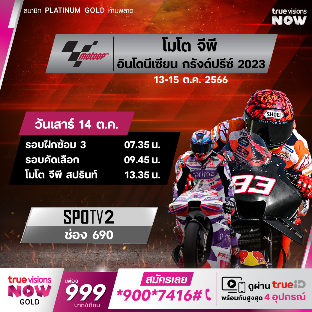 วันนี้มีอะไรดูที่ ทรูวิชั่นส์ ประจำวันเสาร์ที่ 14 ตุลาคม 66 ไฮไลท์อยู่ที่การแข่งขัน โมโต จีพี รายการ อินโดนีเซียน กรังด์ปรีซ์ นอกจากนี้ยังมีศึกเทนนิส เอทีพี ทัวร์ รายการ เซี่ยงไฮ้ มาสเตอร์ส และ ดับเบิ้ลยูทีเอ ทัวร์ สองรายการอย่าง เจิ้งโจว โอเพ่น และ โคเรีย โอเพ่น ขณะที่กอล์ฟยังมีให้ได้ติดตามกันเพียบทั้ง พีจีเอ ทัวร์ รายการ ไชรเนอร์ ชิลเดรนส์ โอเพ่น, ลิฟ กอล์ฟ 2023 ที่ เจดดาห์, เอเชียน ทัวร์ รายการ มาเก๊า โอเพ่น, แอลพีจีเอ ทัวร์ รายการ บิวอิก แอลพีจีเอ เซี่ยงไฮ้ 2023, แบดมินตัน บีดับเบิ้ลยูเอฟ รายการ อาร์คติก โอเพ่น, เวิลด์ สนุกเกอร์ รายการใหญ่อย่าง อู่ฮั่น โอเพ่น และศึกยูเอฟซี ไฟท์ ไนต์ งานนี้ ทรูวิชั่นส์ จัดเต็มให้ชมกันถึงบ้าน