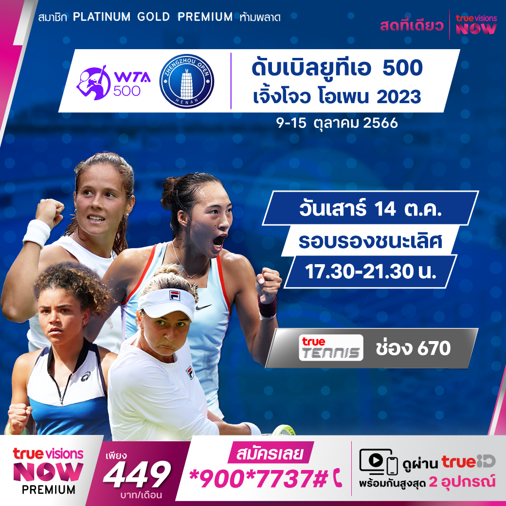 เทนนิสหญิงในแดนมังกร ดับเบิลยูทีเอ ทัวร์ 500 ซีรีส์ เจิ้งโจว โอเพ่น 2023 ชิงเงินรางวัลรวม 780,000 เหรียญสหรัฐฯ ร่วมติดตามและเชียร์นักเทนนิสระดับท็อป เพื่อตำแหน่งแชมป์ที่มีเพียงหนึ่งเดียว ชมสด ทางทรูวิชั่นส์ ที่เดียวรอบรองชนะเลิศ เวลา 17.30 - 21.30 ทางช่อง True Tennis (670)