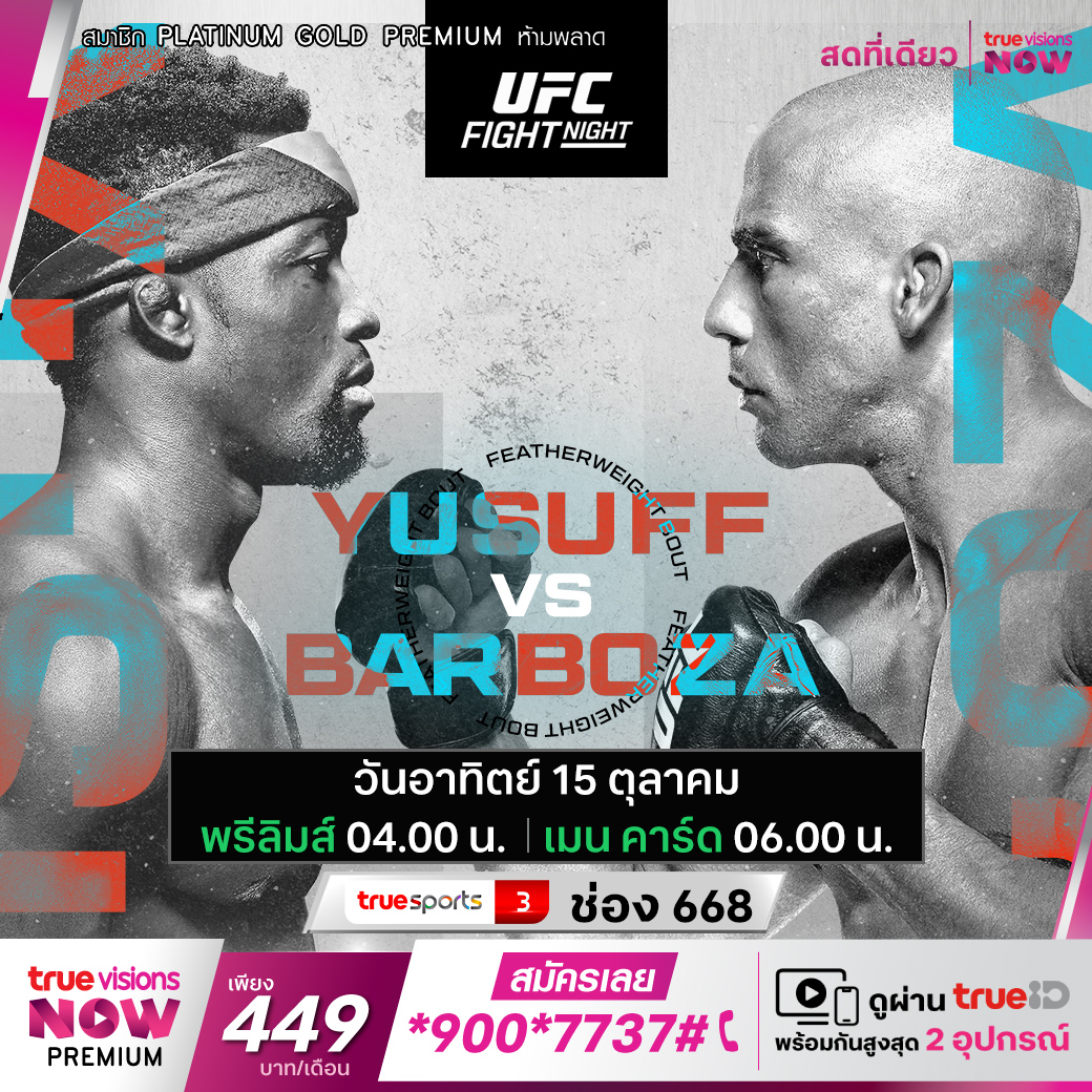 สังเวียนกรงเหล็ก 8 เหลี่ยม ที่ ยูเอฟซี เอเพ็กซ์ ลาสเวกัส เปิดให้สุดยอดนักสู้ยูเอฟซี ขึ้นเวทีพิสูจน์ฝีมือกันอีกครั้งในสัปดาห์นี้ กับ ยูเอฟซี ไฟต์ ไนท์ ดุเดือดแน่นอนกับคู่เอกของรายการปะทะกันในรุ่นเฟเธอร์เวต ซาดิก ยูซูฟ รองแชมป์อันดับ 11 จากไนจีเรีย ปะทะ นักสู้เชิงสูงมากประสบการณ์ เอ็ดสัน บาร์บอซ่า พร้อมคู่ประกอบรายการมันๆ อีกหลายคู่ ชมสด ทางทรูวิชั่นส์ ที่เดียว