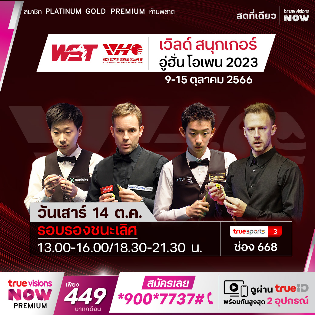 เวิลด์ สนุกเกอร์ รายการเก็บคะแนนสะสมโลกสุดยิ่งใหญ่ อู่ฮั่น โอเพ่น 2023 โดยมีเงินรางวัลรวมถึง 7 แสนปอนด์ แฟนๆ ร่วมติดตามการสอยคิวจุใจครบทุกรอบ และลุ้นกันว่าผู้ชนะในรอบชิงชนะเลิศปีนี้จะเป็นใคร ชมสด ทางทรูวิชั่นส์ ที่เดียวรอบรองชนะเลิศ เวลา 13.00 - 16.00 / 18.30 - 21.30 ทางช่อง TS 3 (668)