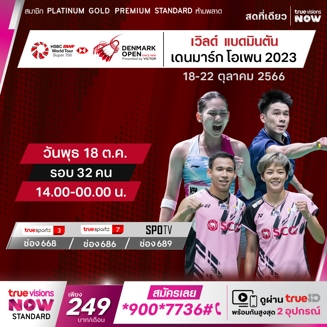 แบดมินตัน เก็บคะแนนสะสมโลก ฤดูกาล 2023 ยังปักหลักอยู่ในแผ่นดินยุโรป สัปดาห์นี้ พบกับรายการใหญ่ ระดับ เวิลด์ ทัวร์ 750 ซีรี่ส์ เดนมาร์ก โอเพ่น 2023 ร่วมเชียร์ทีมแบดมินตันไทย เปิดเพลงตบเพื่อคว้าชัยเหนือนักกีฬาต่างชาติ จุใจครบทุกรอบ ชมสด ทางทรูวิชั่นส์ ที่เดียว
