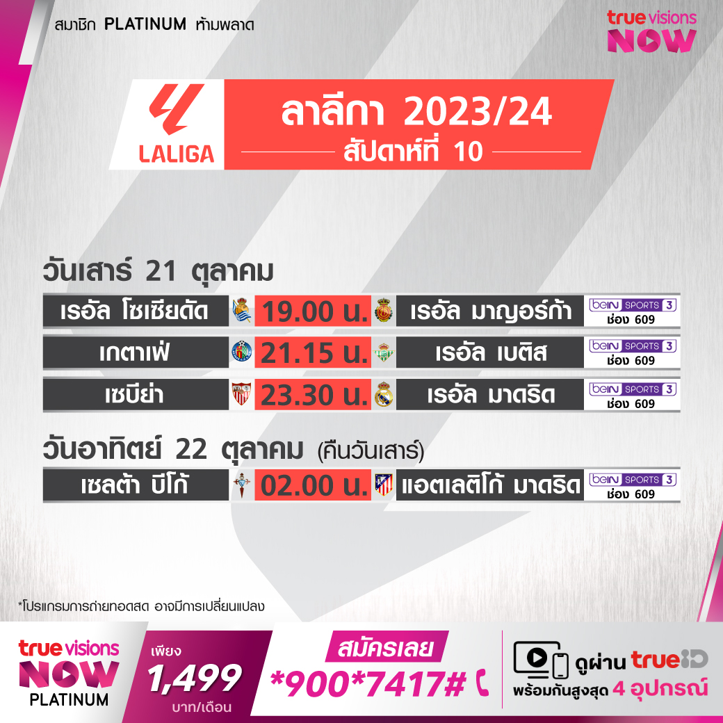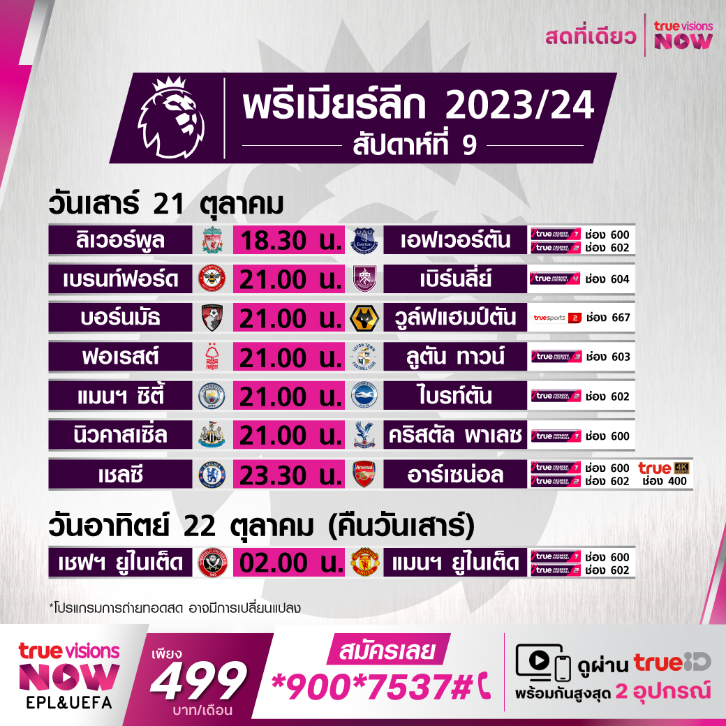 วันนี้มีอะไรดูที่ ทรูวิชั่นส์ ประจำวันเสาร์ที่ 21 ตุลาคม 66 ในส่วนของฟุตบอลยังมีศึกพรีเมียร์ลีก อังกฤษ, กัลโช่ เซเรีย อา อิตาลี, บุนเดสลีกา เยอรมนี, ลา ลีกา สเปน, ลีก เอิง ฝรั่งเศส และ ซาอุดิ โปร ลีก ให้ได้ตามเชียร์กันต่อ ส่วนคอมอเตอร์สปอร์ตพลาดไม่ได้ กับการแข่งขันรถสูตรหนึ่ง ฟอร์มูล่า วัน รายการ ยูเอส กรังด์ปรีซ์ และการแข่งขันจักรยานยนต์ชิงแชมป์โลก โมโต จีพี รายการ ออสเตรเลียน กรังด์ปรีซ์ ขณะที่กีฬาอื่นๆ ยังมีศึกเทนนิส เอทีพี ทัวร์ รายการ เจแปน โอเพ่น, ดับเบิ้ลยูทีเอ ทัวร์ รายการ เจียงสี โอเพ่น และ จัสติน โอเพ่น โมนาสตีร์, กอล์ฟ พีจีเอ ทัวร์ รายการ โซโซ่ แชมเปี้ยนชิพ, ลิฟ กอล์ฟ ลีก ไมอามี่, แอลพีจีเอ ทัวร์ รายการ บีเอ็มดับเบิ้ลยู เลดี้ส์ แชมเปี้ยนชิพ, แบดมินตัน บีดับเบิ้ลยูเอฟ รายการ เดนมาร์ก โอเพ่น และศึกยูเอฟซี 294 งานนี้ ทรูวิชั่นส์ จัดเต็มให้ชมกันถึงบ้าน
