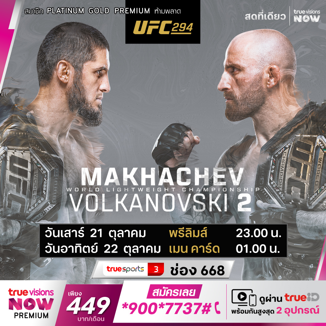 เดือดแน่นอน เมื่อนักสู้ที่เก่งที่สุดในโลก 2 คน ที่มีดีกรี 2 แชมป์โคจรมาพบกันเป็นครั้งที่ 2 ในศึกรีแมตช์ของศึกใหญ่ประจำเดือนตุลาคม ยูเอฟซี 294 อิลาม มาฮาเชฟ แชมป์รุ่นไลต์เวต เปิดโอกาสให้ อเล็กซานเดอร์ โวลคานอฟสกี้ แชมป์รุ่นเฟเธอร์เวต ล้างตาอีกครั้ง หลังจากปะทะกันแบบสุดมันส์มาแล้ว ร่วมด้วย คามารู อุสมาน อดีตแชมป์เวลเตอร์เวต พบ ฮัมซัท ชิมาเยฟ สดจาก อาบูดาบี สหรัฐอาหรับเอมิเรตส์ ชมสด ทางทรูวิชั่นส์ ที่เดียว