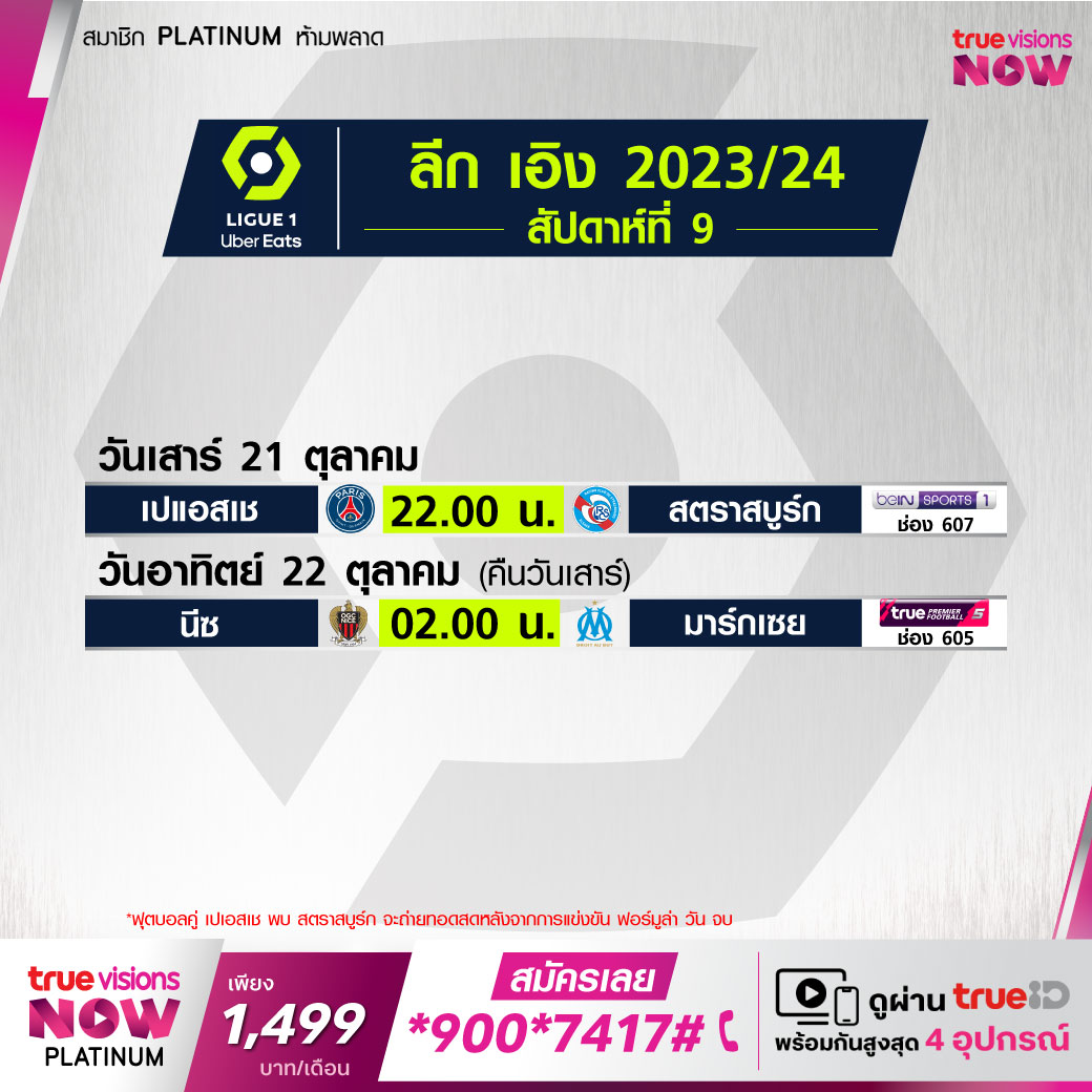 PSG vs Strasbourg เวลา 22.20-00.00 ทางช่อง beIN 1 (607)