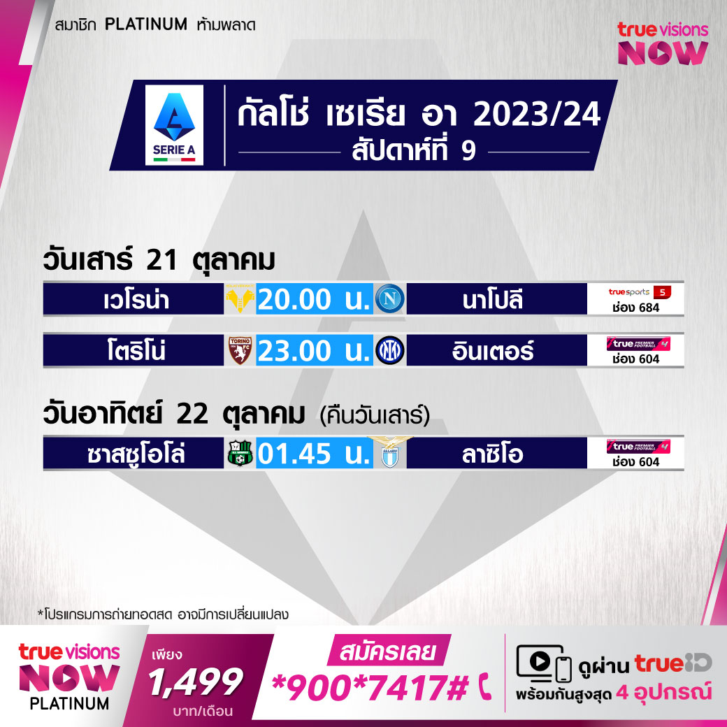 Torino vs Inter เวลา 23.00-01.00 ทางช่อง TPF 4 (604)