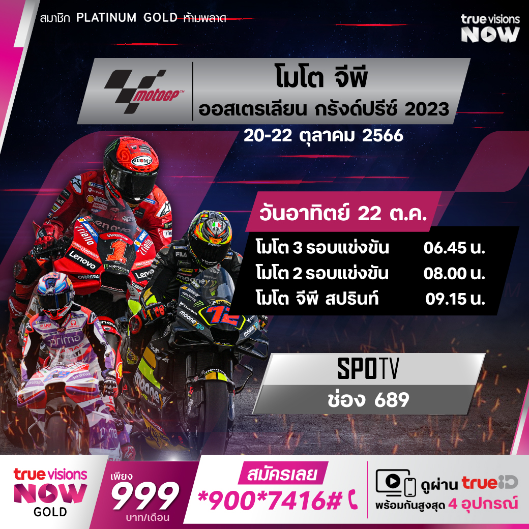 โมโต จีพี เวิลด์ แชมเปี้ยนชิพ เดินทางมาถึงสนามที่ 10 ที่เป็นครึ่งทางของฤดูกาล 2023 กับรายการ ออสเตรเลียน กรังด์ปรีซ์ ที่สนาม ฟิลลิป ไอส์แลนด์ กรังด์ปรีซ์ เซอร์กิต ชมสดจุใจครบทุกช่วง ในทุกรุ่น โมโต 3, โมโต 2 และโมโต จีพี