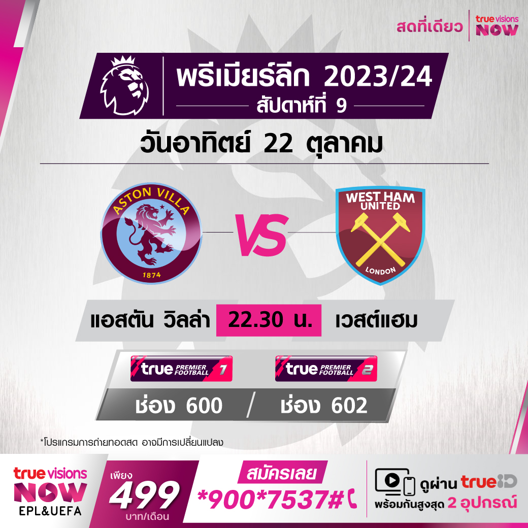 Aston Villa vs West Ham Utd เวลา 22:30 - 00:30 ทางช่อง TPF 1 (600) / TPF 2 (602)