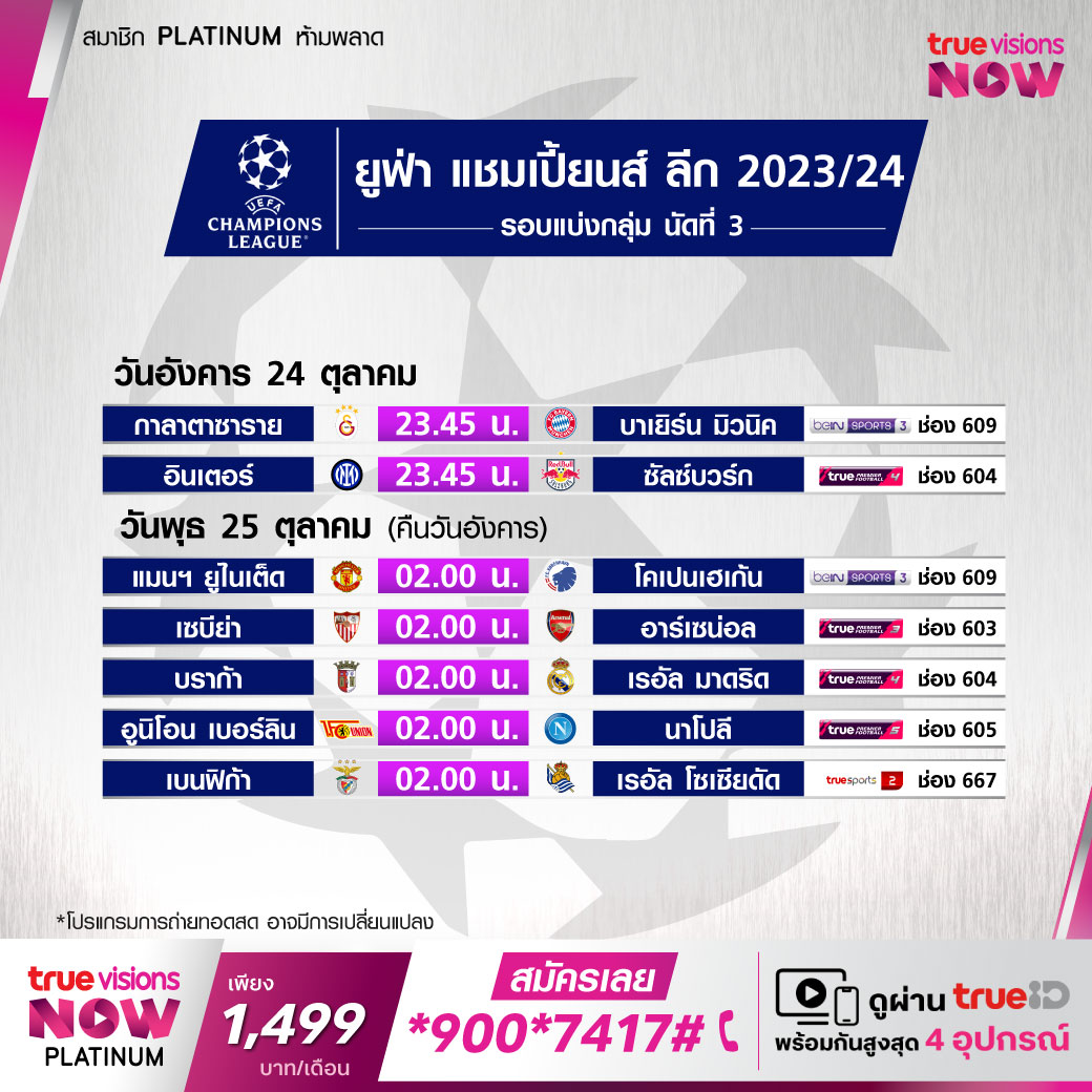 วันนี้มีอะไรดูที่ ทรูวิชั่นส์ ประจำวันอังคารที่ 24 ตุลาคม 66 ในส่วนของฟุตบอลยังมีศึกยูฟ่า แชมเปี้ยนส์ ลีก และ เอเอฟซี แชมเปี้ยนส์ ลีก ให้ได้ตามเชียร์กันต่อ ขณะที่กีฬาอื่นๆ ยังมีศึกเทนนิส เอทีพี ทัวร์ รายการ สวิส อินดอร์ส บาเซิ่ล, เวิลด์ สนุกเกอร์ รายการ นอร์ธเทิร์น ไอร์แลนด์ โอเพ่น และศึกอเมริกันฟุตบอลเอ็นเอฟแอล งานนี้ ทรูวิชั่นส์ จัดเต็มให้ชมกันถึงบ้าน