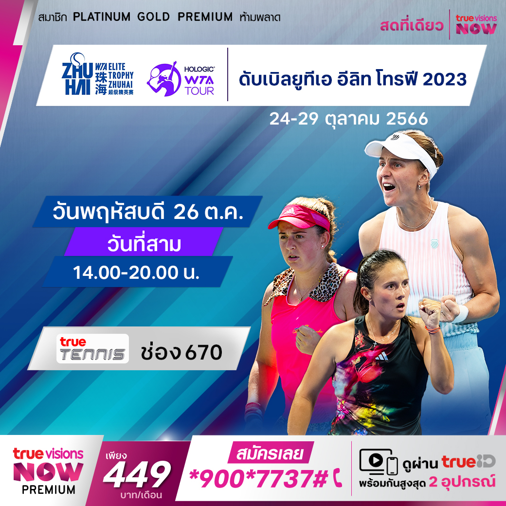 แฟนๆ พลาดไม่ได้ กับเทนนิสหญิงรายการสุดยิ่งใหญ่ที่จะแข่งปิดท้ายฤดูกาล 2023 กับรายการ ดับเบิ้ลยูทีเอ อีลิท โทรฟี่ ที่กลับมาแข่งอีกครั้ง พร้อมด้วยสุดยอดฝีมือนักเทนนิสหญิง 12 คน มาดวลกัน เพื่อพิสูจน์กันว่าใครจะเป็นแชมป์ในปีนี้ สดจากซูไห่ ประเทศจีน ชมสด จุใจ ครบทุกรอบ