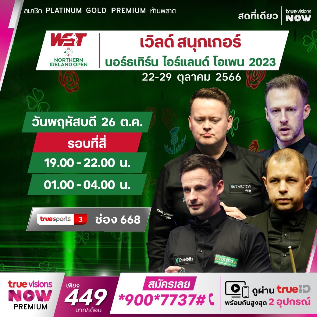 ศึกสอยคิวระดับโลก เวิลด์ สนุกเกอร์ ฤดูกาล 2023/24 สัปดาห์นี้ดวลคิวที่สหราชอาณาจักร กับรายการสำคัญ นอร์ธเทิร์น ไอร์แลนด์ โอเพ่น 2023 รายการที่ 2 ของ โฮม เนชั่นส์ ซีรี่ส์ เชียร์ซูเปอร์สตาร์ของโลกสู้กันเพื่อครองแชมป์และชูถ้วย อเล็กซ์ ฮิกกินส์ โทรฟี่ สดที่เดียว ชมสด ทางทรูวิชั่นส์ ที่เดียว