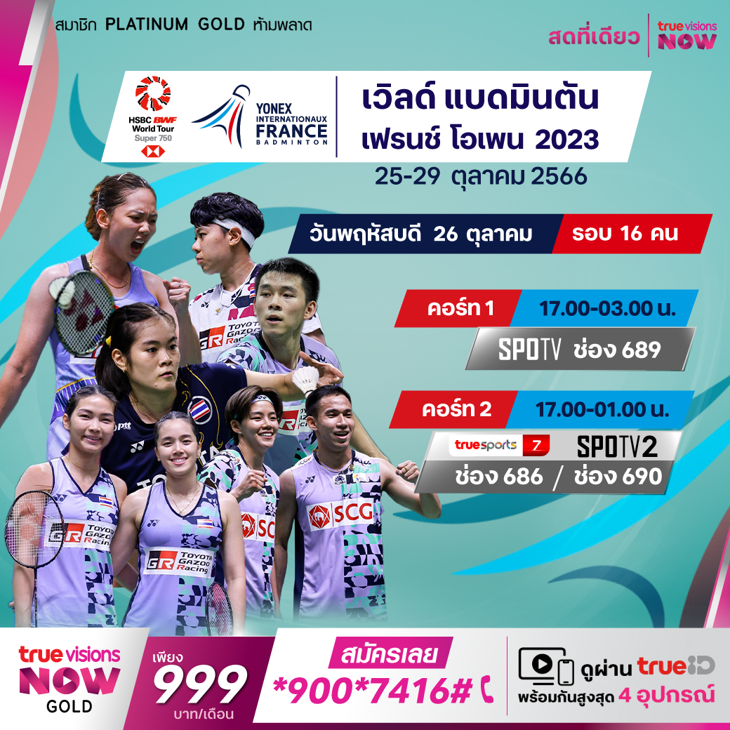 ศึกใหญ่ของ แบดมินตัน บีดับเบิ้ลยูเอฟ รายการเก็บคะแนนสะสมโลกของฤดูกาล 2023 สัปดาห์นี้ไปกันที่กรุงปารีส ประเทศฝรั่งเศส กับรายการระดับ เวิลด์ ทัวร์ ซูเปอร์ 750 เฟร้นช์ โอเพ่น ร่วมเชียร์ทีมแบดมินตันไทยและมือท็อปของโลกแย่งกันเป็นแชมป์ สดจุใจ ชมสด ทางทรูวิชั่นส์ ที่เดียว
