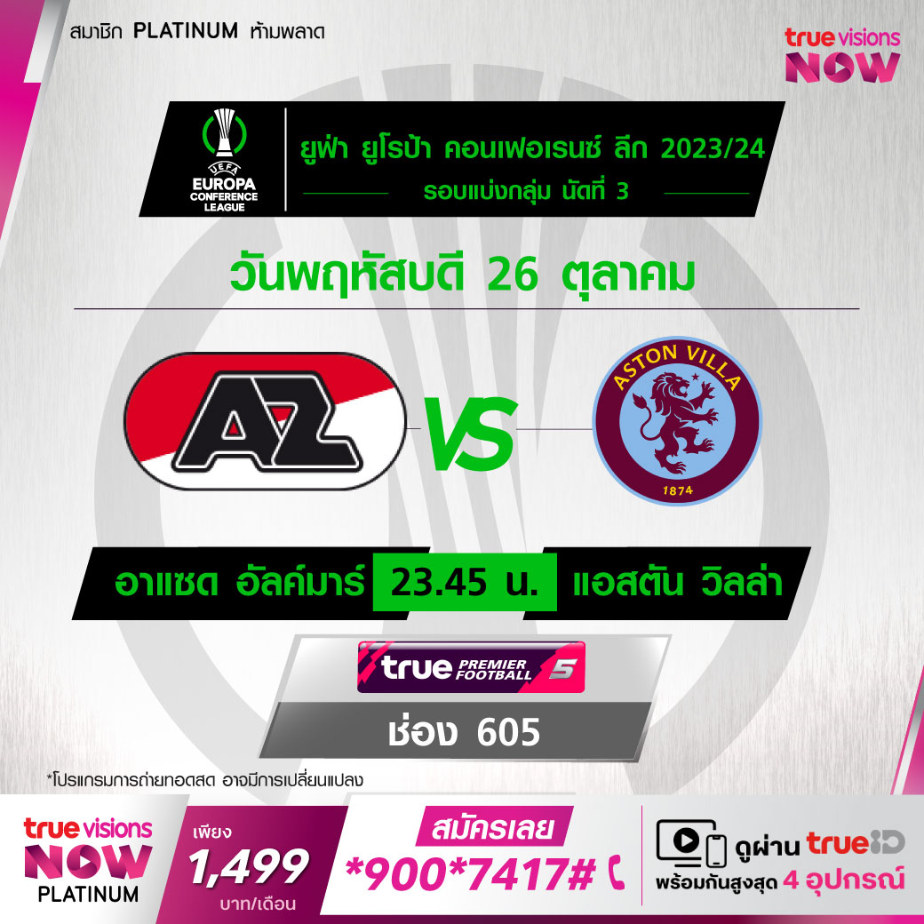 AZ Alkmaar vs Aston Villa เวลา 23.45-01.45 ทางช่อง TPF 5 (605)