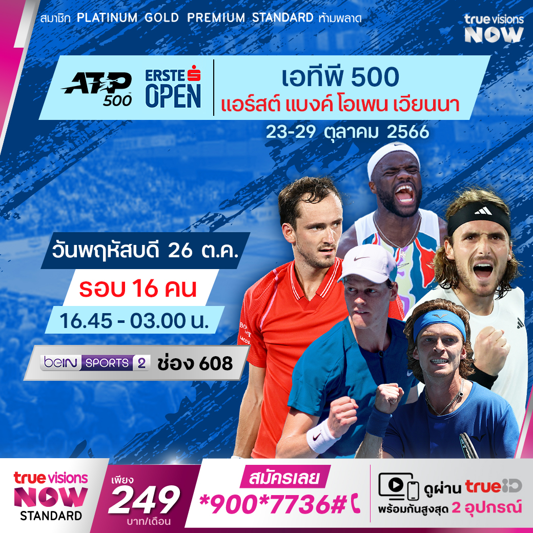 เทนนิส เอที ทัวร์ 500 ซึรี่ส์ แอร์ส แบ้งค์โอเพ่น เวียนนา ประเทศออสเตรีย ปีนี้ มือท็อปๆของโลกที่ต่างเป็นขวัญใจของแฟนๆ พร้อมใจมาร่วมดวลแร็คเก็ต เพื่อเป้าหมายเดียวกันคือ ตำแหน่งชนะเลิศรายการนี้ ร่วมลุ้นกันว่า จะก้าวขึ้นมาเป็นแชมป์ชม สด จุใจ ทาง ทรูวิชันส์ รอบ 16 คน เวลา 16.45 - 03.00 ทางช่อง beIN 2 (608)