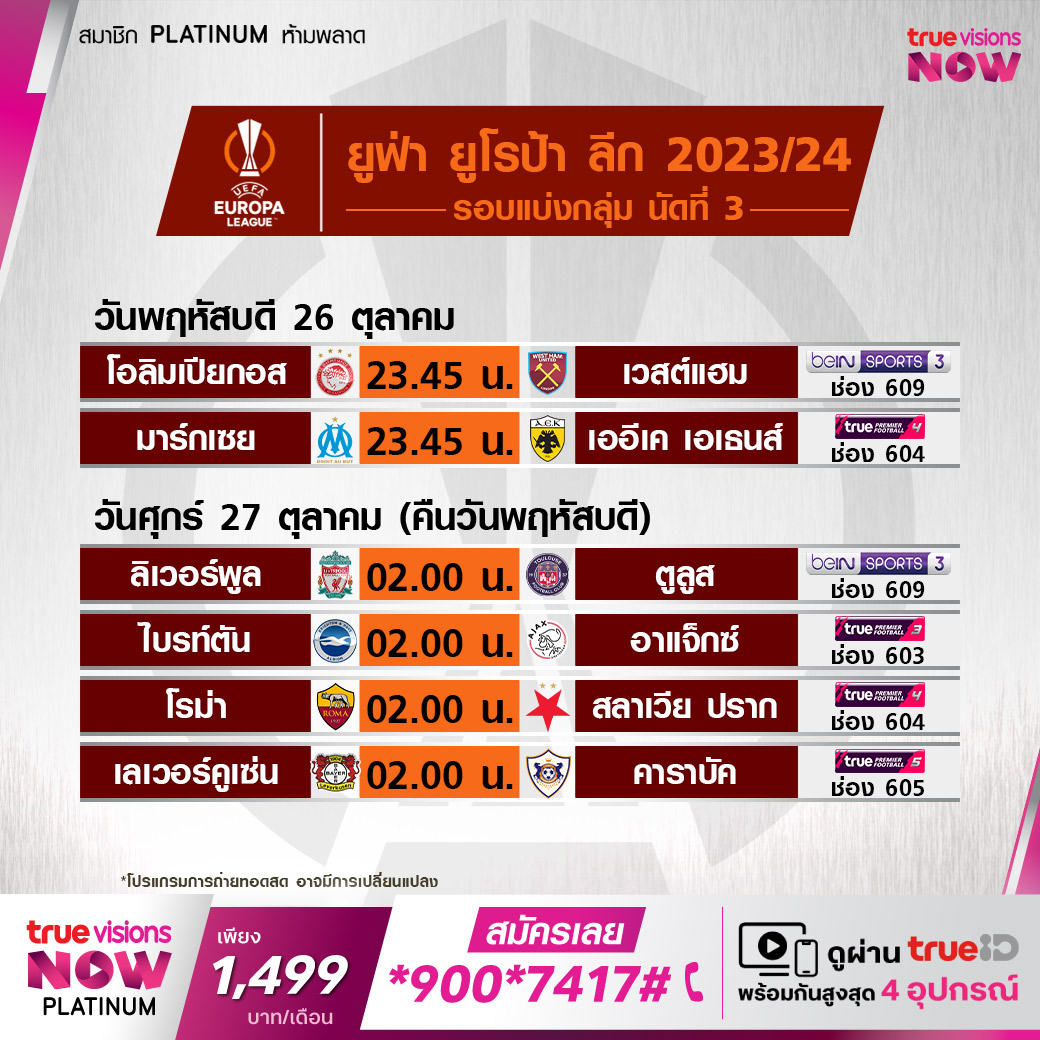 วันนี้มีอะไรดูที่ ทรูวิชั่นส์ ประจำวันพฤหัสบดีที่ 26 ตุลาคม 66 ในส่วนของฟุตบอลยังมีศึกยูฟ่า ยูโรป้า ลีก, ยูฟ่า ยูโรป้า คอนเฟอเรนซ์ ลีก และ ซาอุดิ โปร ลีก ให้ได้ตามเชียร์กันต่อ ขณะที่กีฬาอื่นๆ ยังมีศึกเทนนิส เอทีพี ทัวร์ รายการ แอร์ส แบงค์ เวียนนา โอเพ่น, ดับเบิ้ลยูทีเอ ทัวร์ รายการ อีลิท โทรฟี่, กอล์ฟ แอลพีจีเอ ทัวร์ รายการ เมย์แบงค์ แชมเปี้ยนชิพ, แบดมินตัน บีดับเบิ้ลยูเอฟ รายการ เฟร้นซ์ โอเพ่น, เวิลด์ สนุกเกอร์ รายการ นอร์ธเทิร์น ไอร์แลนด์ โอเพ่น และอเมริกันฟุตบอลเอ็นเอฟแอล งานนี้ ทรูวิชั่นส์ จัดเต็มให้ชมกันถึงบ้าน