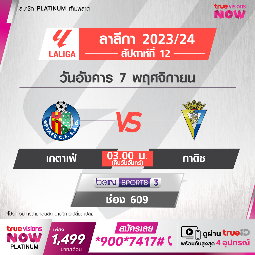 Getafe vs Cadiz เวลา 03.00-05.00 ทางช่อง beIN 3 (609)