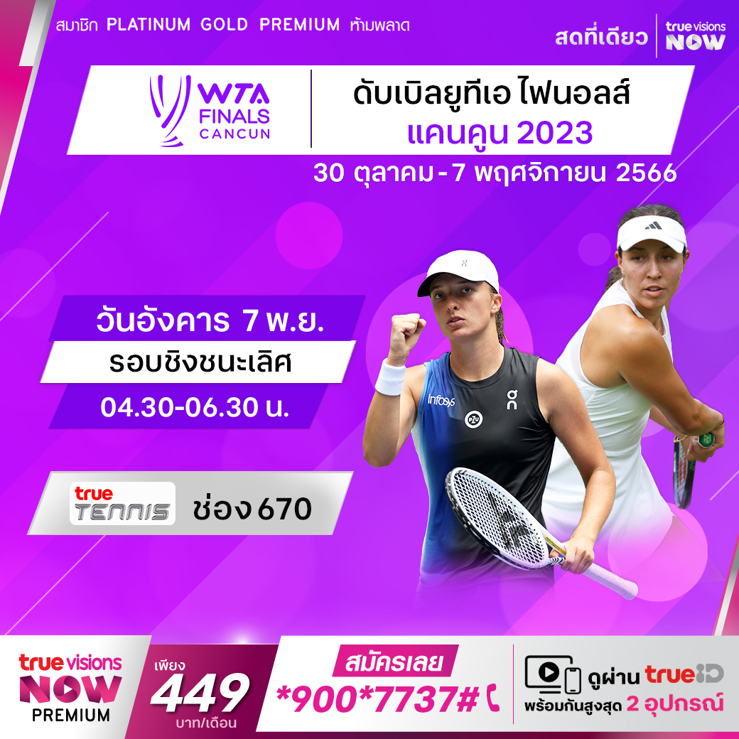 เทนนิสหญิง ดับเบิ้ลยูทีเอ ไฟนอลส์ แคนคูน อีเว้นท์ที่คัดเฉพาะนักเทนนิสที่ผลงานดีและเก่งที่สุดของปีนี้ 8 คนในประเภทเดี่ยว มาดวลกันเพื่อชิงตำแหน่งแชมป์อันทรงเกียรติ เดินทางมาถึงในรอบชิงชนะเลิศ ใครจะคว้าแชมป์สุดยอดนักเทนนิสหญิงของปีนี้ไปครอง ชมสด จุใจ ทางทรูวิชั่นส์ ที่เดียววันอังคาร 7 พ.ย. รอบชิงชนะเลิศ เวลา 04.30 - 06.30 ทางช่อง True Tennis (670)