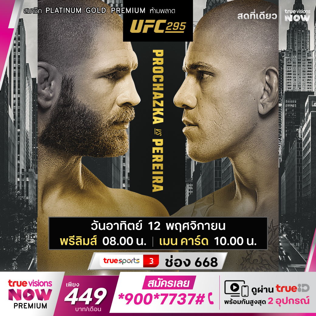 ระเบิดความมันส์ระดับ 5 ดาวเต็ม สำหรับศึกใหญ่ประจำเดือนนี้ ยูเอฟซี 295 จากสังเวียนระดับโลก เมดิสัน สแควร์ การ์เด้น มหานครนิวยอร์ค สหรัฐอเมริกา คู่เอกสุดเดือด ชิงแชมป์ไลต์เฮฟวี่เวต ยีรี่ โปรฮาสก้า อดีตแชมป์รุ่นนี้ คัมแบ็กหวังทวงเข็มขัดแชมป์คืน พบกับ อเล็กซ์ เปเฮร่า จากบราซิล และคู่เอกร่วม มันส์ไม่แพ้กัน ชิงแชมป์เฉพาะกาลรุ่นเฮฟวี่เวต เซอร์เก พาฟโลวิช จอมน็อกเอาท์จากรัสเซีย ปะทะ ทอม แอสปินอลล์ จากอังกฤษ สดที่เดียว ที่ ทรูวิชั่นส์