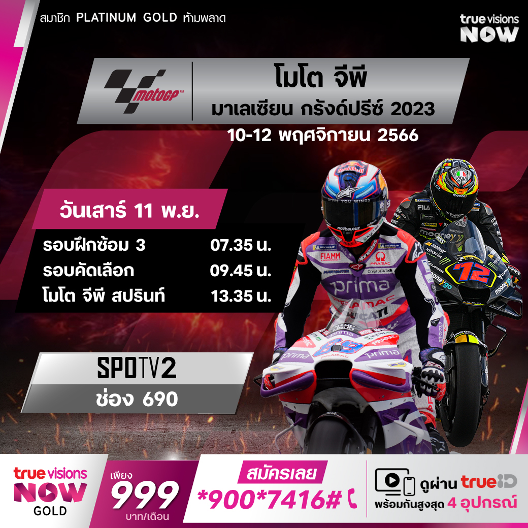 โมโตจีพี เวิลด์ แชมเปียนชิพ 3 สนามสุดท้าย เริ่มนับ ถอยหลังในสัปดาห์สุดท้าย สัปดาห์นี้มาเลเซียน กรังด์ปรีซ์ นักบิดทุกทีมมีเท่าไหร่ ใส่กันสุดไมล์ ทุกโค้ง ทุกทางตรง เพื่อจบในอันดับที่ลุ้นแชมป์ จากสนาม เซปัง อินเตอร์ เนชั่นแนล เซอร์กิต ประเทศมาเลเซีย ทุกช่วงการแข่งขัน ชมสด ทางทรูวิชั่นส์ ที่เดียว