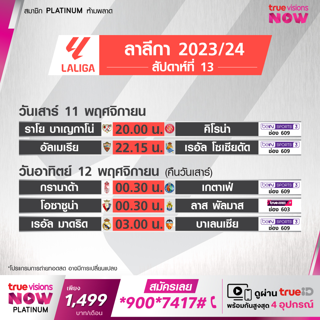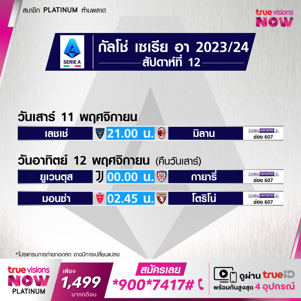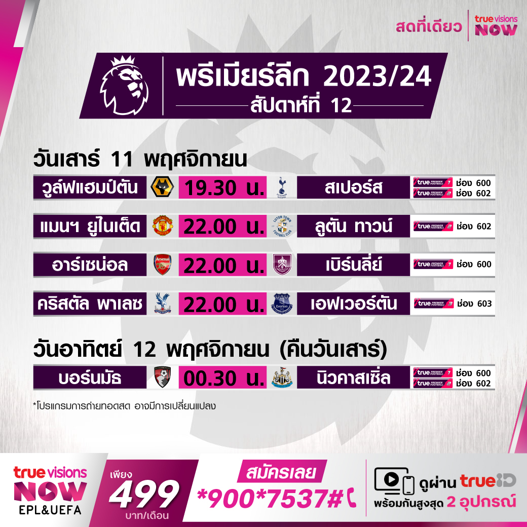 วันนี้มีอะไรดูที่ ทรูวิชั่นส์ ประจำวันเสาร์ที่ 11 พฤศจิกายน 66 ในส่วนของฟุตบอลยังมีศึกพรีเมียร์ลีก อังกฤษ, กัลโช่ เซเรีย อา อิตาลี, บุนเดสลีกา เยอรมนี, ลา ลีกา สเปน, ลีก เอิง ฝรั่งเศส และ ซาอุดิ โปร ลีก ให้ได้ตามเชียร์กันต่อ ขณะที่กีฬาอื่นๆ ยังมีศึกโมโต จีพี รายการ มาเลเซียน กรังด์ปรีซ์, กอล์ฟพีจีเอ ทัวร์ รายการ บัทเทอร์ฟิลด์ เบอร์มิวด้า แชมเปี้ยนชิพ, เอเชียนทัวร์ รายการ ฮ่องกง โอเพ่น, แอลพีจีเอ ทัวร์ รายการ อันนิก้า ดริฟเว่น บาย เกนบริดจ์, แบดมินตัน บีดับเบิ้ลยูเอฟ รายการ โคเรีย มาสเตอร์ส, ศึกยูเอฟซี 295, ศึกเวิลด์ สนุกเกอร์ รายการ อินเตอร์เนชั่นแนล แชมเปี้ยนชิพ และบาสเกตบอลเอ็นบีเอ งานนี้ ทรูวิชั่นส์ จัดเต็มให้ชมกันถึงบ้าน