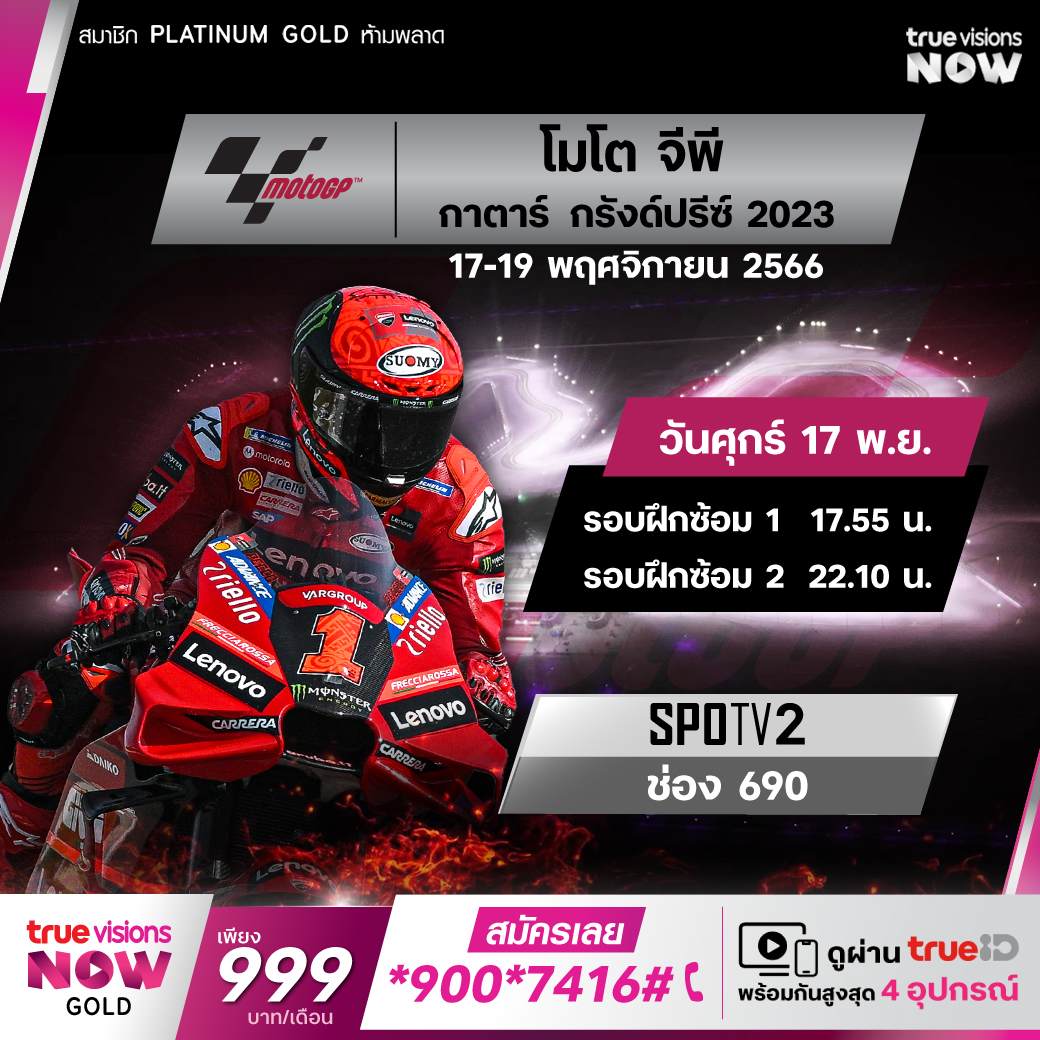 ความมันส์ทะลุถึงขั้นขีดสุดสำหรับ โมโต จีพี เวิลด์ แชมเปี้ยนชิพ สนามรองสุดท้ายของฤดูกาล 2023 นักบิดทุกคนจากทุกทีมทั้ง 3 รุ่น พร้อมจัดเต็มพิกัด เพื่อประกาศศักดาและตำแหน่งบนโพเดี้ยม สัปดาห์นี้พบกับ กาตาร์ กรังด์ปรีซ์ ดุเดือดแน่นอน สดทุกช่วงการแข่งขัน จากสังเวียน ลูเซล อินเตอร์เนชั่นแนล เซอร์กิต ใครจะคว้าชัย ชมสดจุใจ ที่ ทรูวิชั่นส์