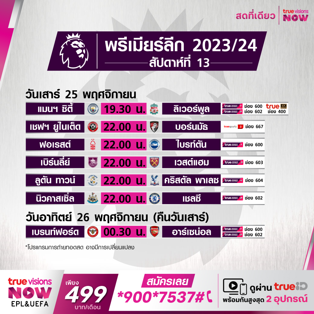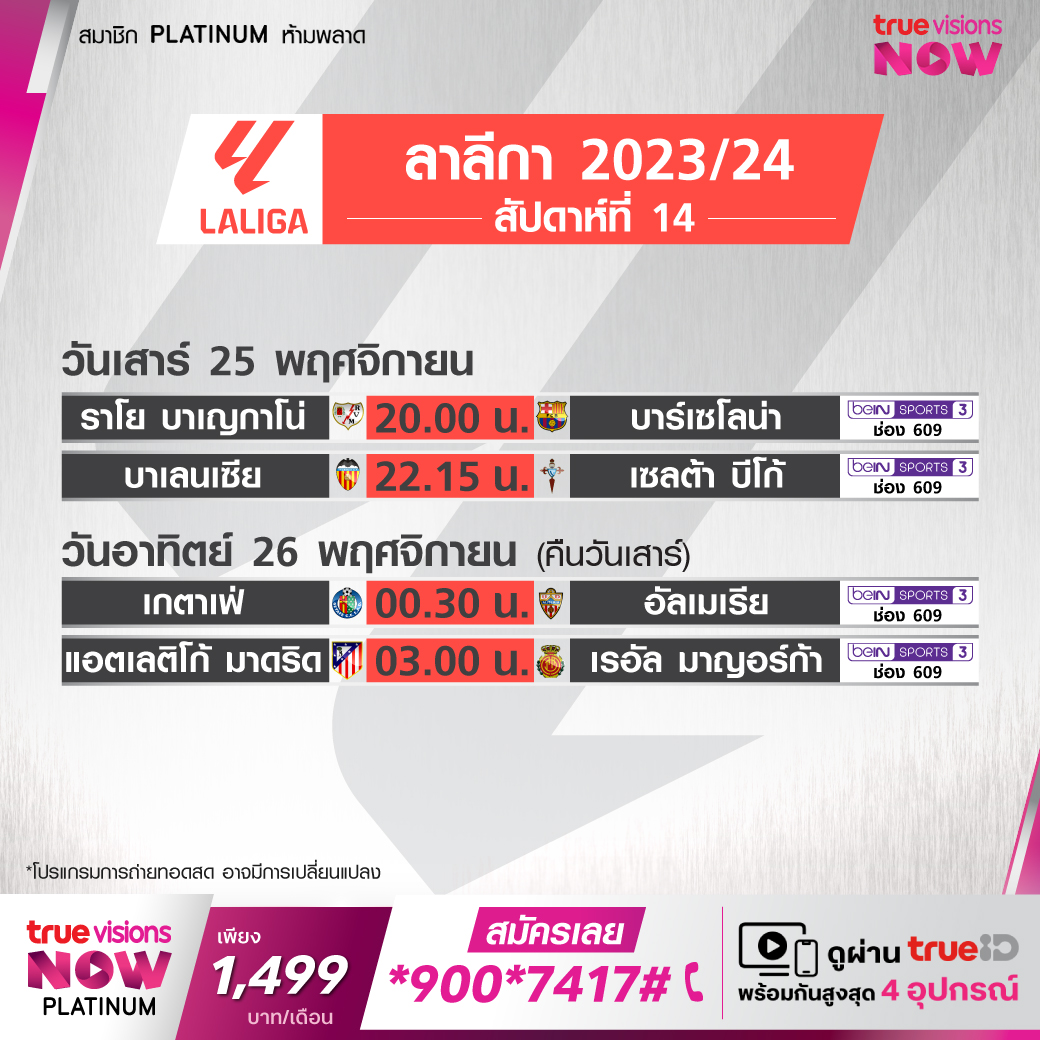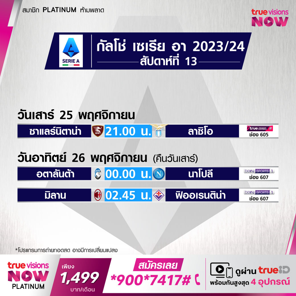 วันนี้มีอะไรดูที่ ทรูวิชั่นส์ ประจำวันเสาร์ที่ 25 พฤศจิกายน 66 ในส่วนของฟุตบอลยังมีศึกพรีเมียร์ลีก อังกฤษ, กัลโช่ เซเรีย อา อิตาลี, บุนเดสลีกา เยอรมนี, ลา ลีกา สเปน, ลีก เอิง ฝรั่งเศส และ ซาอุดิ โปร ลีก ให้ได้ตามเชียร์กันต่อ ส่วนกีฬาอื่นๆ ยังมีศึกฟอร์มูล่า วัน รายการ อาบูดาบี กรังด์ปรีซ์, โมโต จีพี รายการ บาเลนเซีย กรังด์ปรีซ์, ศึกเทนนิสชิงแชมป์โลกประเภททีมชาย เดวิส คัพ ไฟนอลส์ 2023, กอล์ฟหญิง เลดี้ส์ ยูโรเปี้ยน ทัวร์ รายการ อันดาลูเซีย คอสต้า เดล โซล โอเพ่น เด เอสปันญ่า, แบดมินตัน บีดับเบิ้ลยูเอฟ รายการ ไชน่า มาสเตอร์ส 2023, ศึกเวิลด์ สนุกเกอร์ รายการ ยูเค แชมเปี้ยนชิพ และศึกบาสเกตบอลเอ็นบีเอ งานนี้ ทรูวิชั่นส์ จัดเต็มให้ชมกันถึงบ้าน