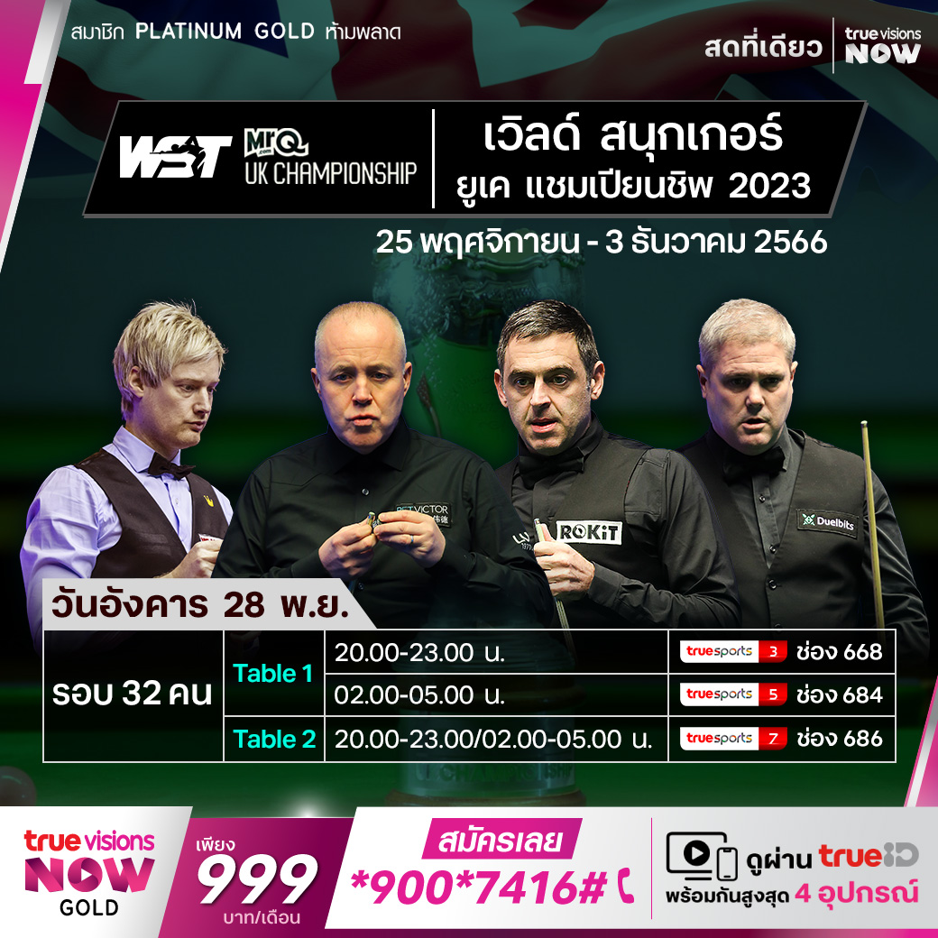 เวิลด์ สนุกเกอร์ ส่งท้ายปี กับรายการที่ยิ่งใหญ่ระดับทริปเปิ้ลคราวน์ รายการ ยูเค แชมเปี้ยนชิพ 2023 ที่แฟนๆ จะได้สัมผัสกับเกมระดับโลกจากบรรดาตัวเทพของวงการ ที่พร้อมสร้างสีสันและเปิดศึกดวลกันเพื่อชัยชนะ ทุกแต้ม ทุกเบรก ทุกเฟรม ทุกชัยชนะ เพื่อตำแหน่งแชมป์แห่งศักดิ์ศรีจากสังเวียน ยอร์ค บาร์บิเคน ประเทศอังกฤษ สดครบทุกแมตช์ ชมสด ทางทรูวิชั่นส์ ที่เดียว