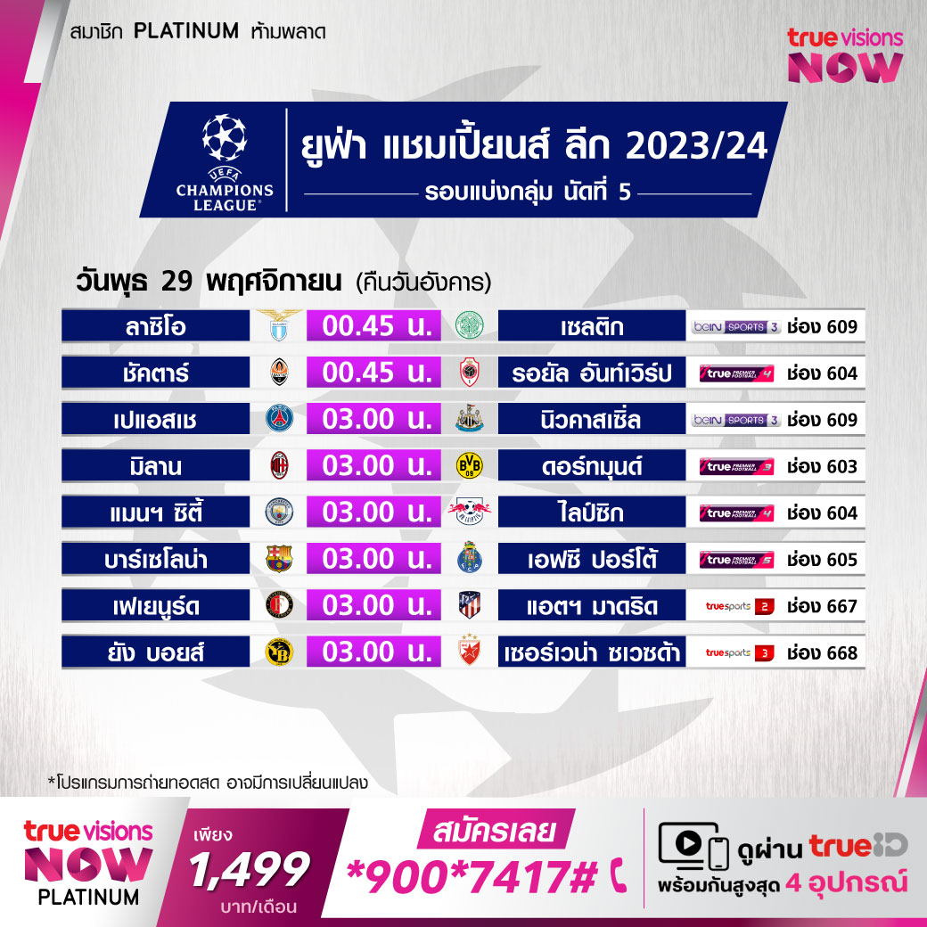 วันนี้มีอะไรดูที่ ทรูวิชั่นส์ ประจำวันอังคารที่ 28 พฤศจิกายน 66 ในส่วนของฟุตบอลยังมีศึกยูฟ่า แชมเปี้ยนส์ ลีก และ เอเอฟซี แชมเปี้ยนส์ ลีก ให้ได้ตามเชียร์กันต่อ ส่วนกีฬาอื่นๆ ยังมีศึกเทนนิส เน็กซ์ เจน เอทีพี ไฟนอลส์ และ ศึกเวิลด์ สนุกเกอร์ รายการ ยูเค แชมเปี้ยนชิพ งานนี้ ทรูวิชั่นส์ จัดเต็มให้ชมกันถึงบ้าน