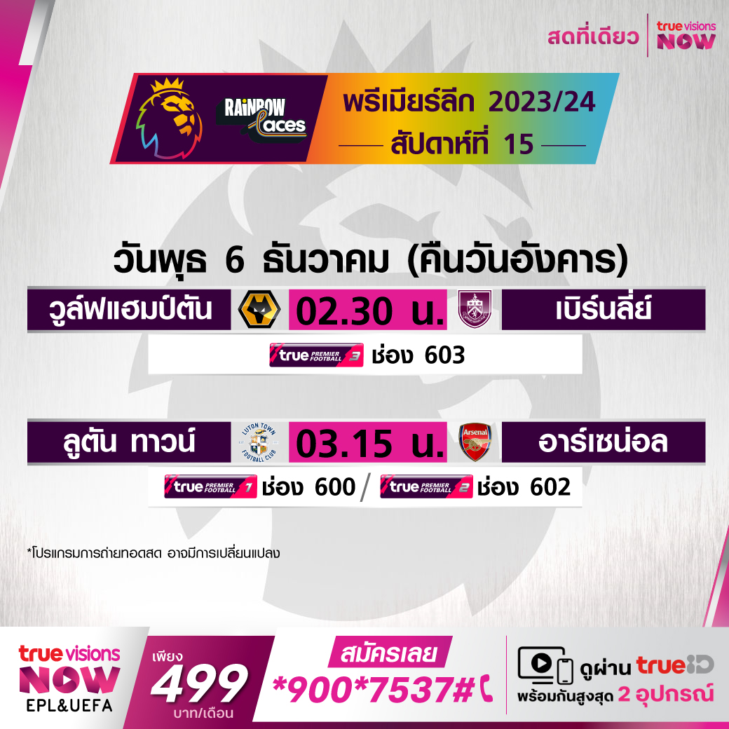 Luton Town vs Arsenal เวลา 03:15 - 05:15 ทางช่อง TPF 1(600) / TPF 2 (602)