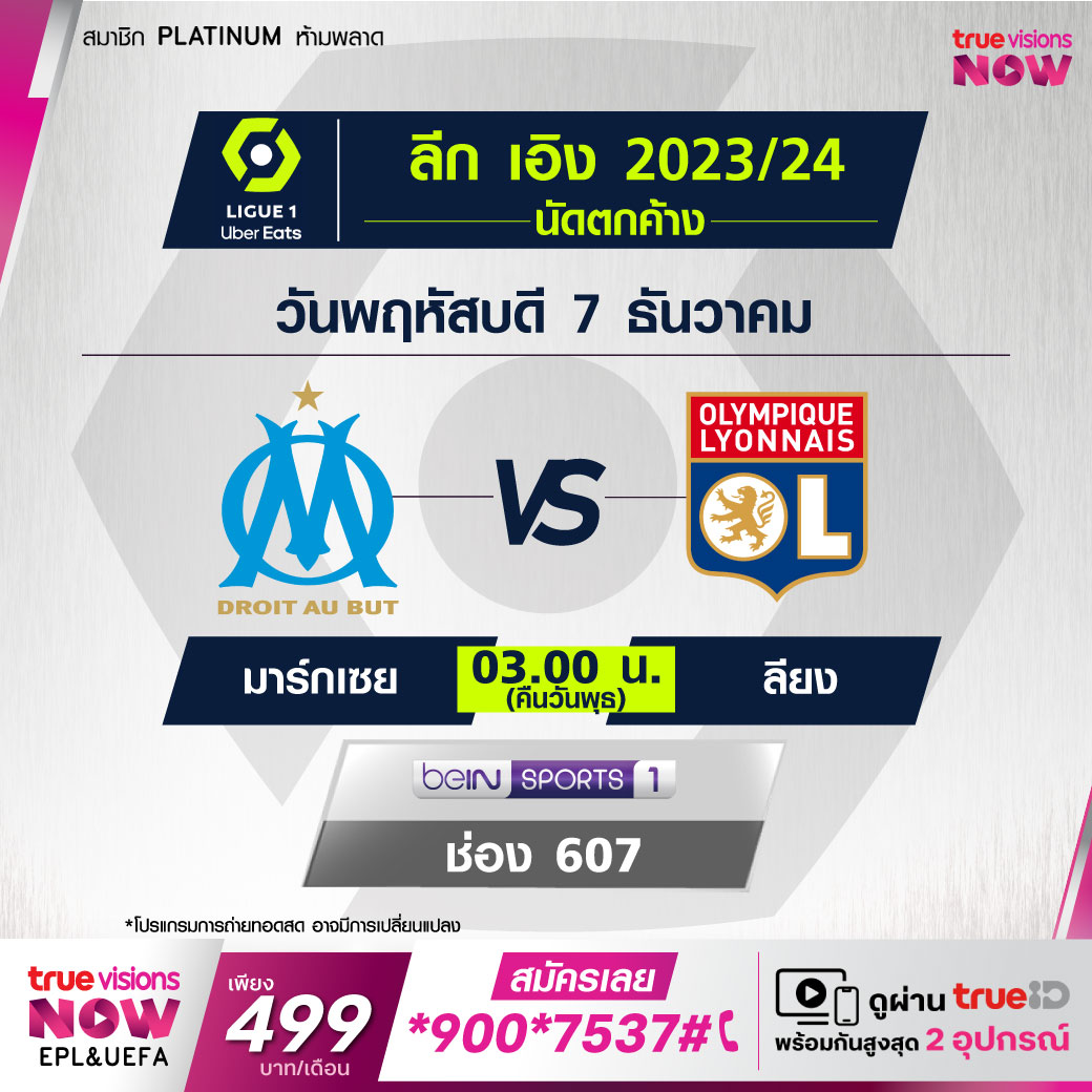 Marseille vs Lyon เวลา 03.00-05.00 ทางช่อง beIN 1 (607)