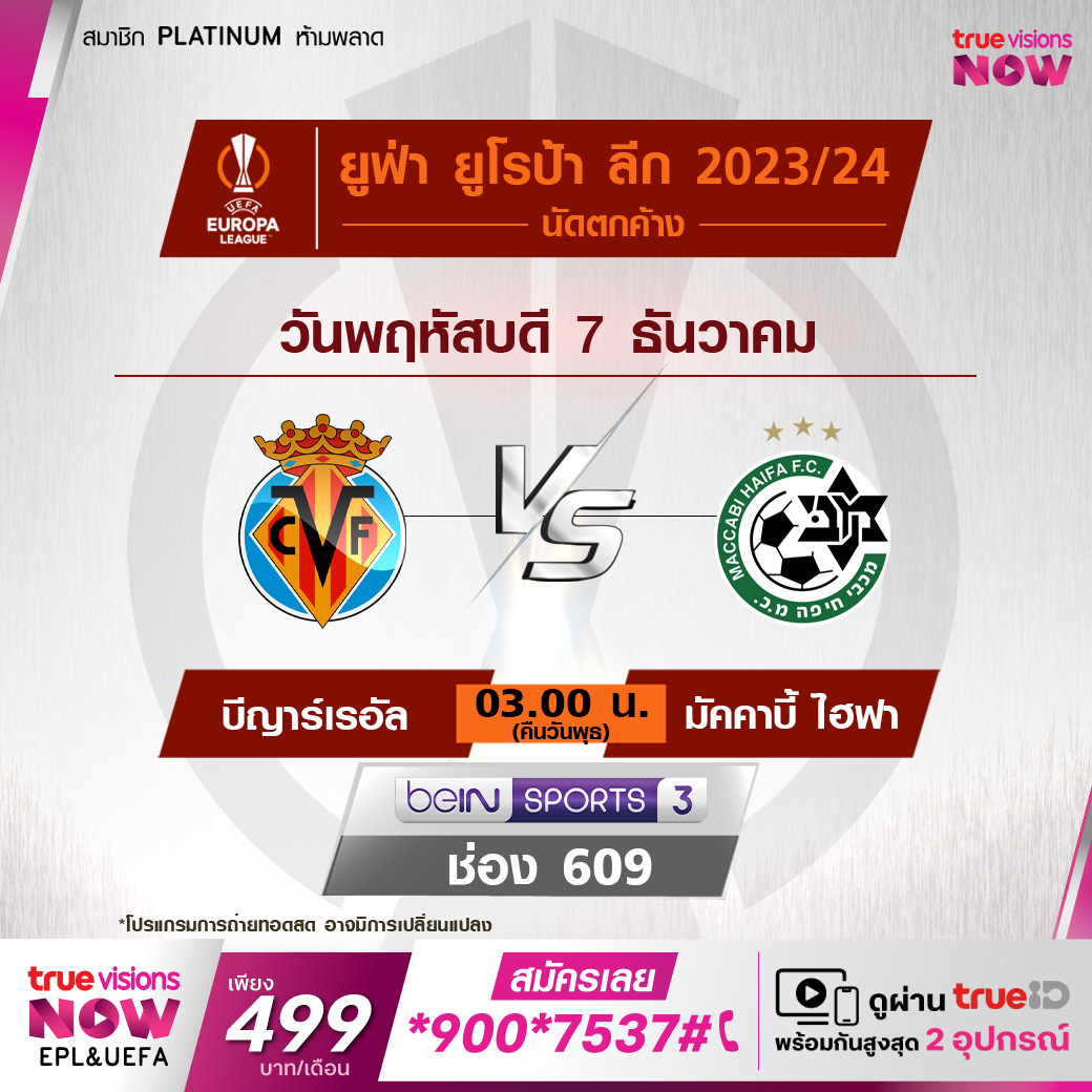 Villarreal vs Maccabi Haifa เวลา 03.00-05.00 ทางช่อง beIN 3 (609)