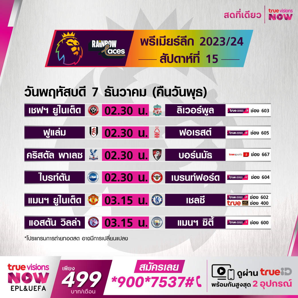 วันนี้มีอะไรดูที่ ทรูวิชั่นส์ ประจำวันพุธที่ 6 ธันวาคม 66 ในส่วนของฟุตบอลยังมีศึกพรีเมียร์ลีก อังกฤษ, ยูฟ่า ยูโรป้า ลีก, ลีก เอิง ฝรั่งเศส และ เอเอฟซี แชมเปี้ยนส์ ลีก ให้ได้ตามเชียร์กันต่อ รวมถึงศึก เวิลด์ สนุกเกอร์ ชู๊ตเอาท์ 2023 งานนี้ ทรูวิชั่นส์ จัดเต็มให้ชมกันถึงบ้าน