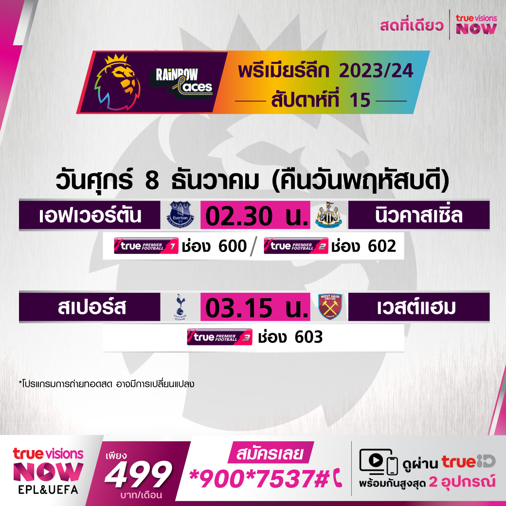วันนี้มีอะไรดูที่ ทรูวิชั่นส์ ประจำวันพฤหัสบดีที่ 7 ธันวาคม 66 ในส่วนของฟุตบอลยังมีศึกพรีเมียร์ลีก อังกฤษ และ ลีก เอิง ฝรั่งเศส ให้ได้ตามเชียร์กันต่อ ส่วนกีฬาอื่นๆ ยังมีศึก เวิลด์ สนุกเกอร์ ชู๊ตเอาท์ 2023 และศึกอเมริกันฟุตบอลเอ็นเอฟแอล งานนี้ ทรูวิชั่นส์ จัดเต็มให้ชมกันถึงบ้าน