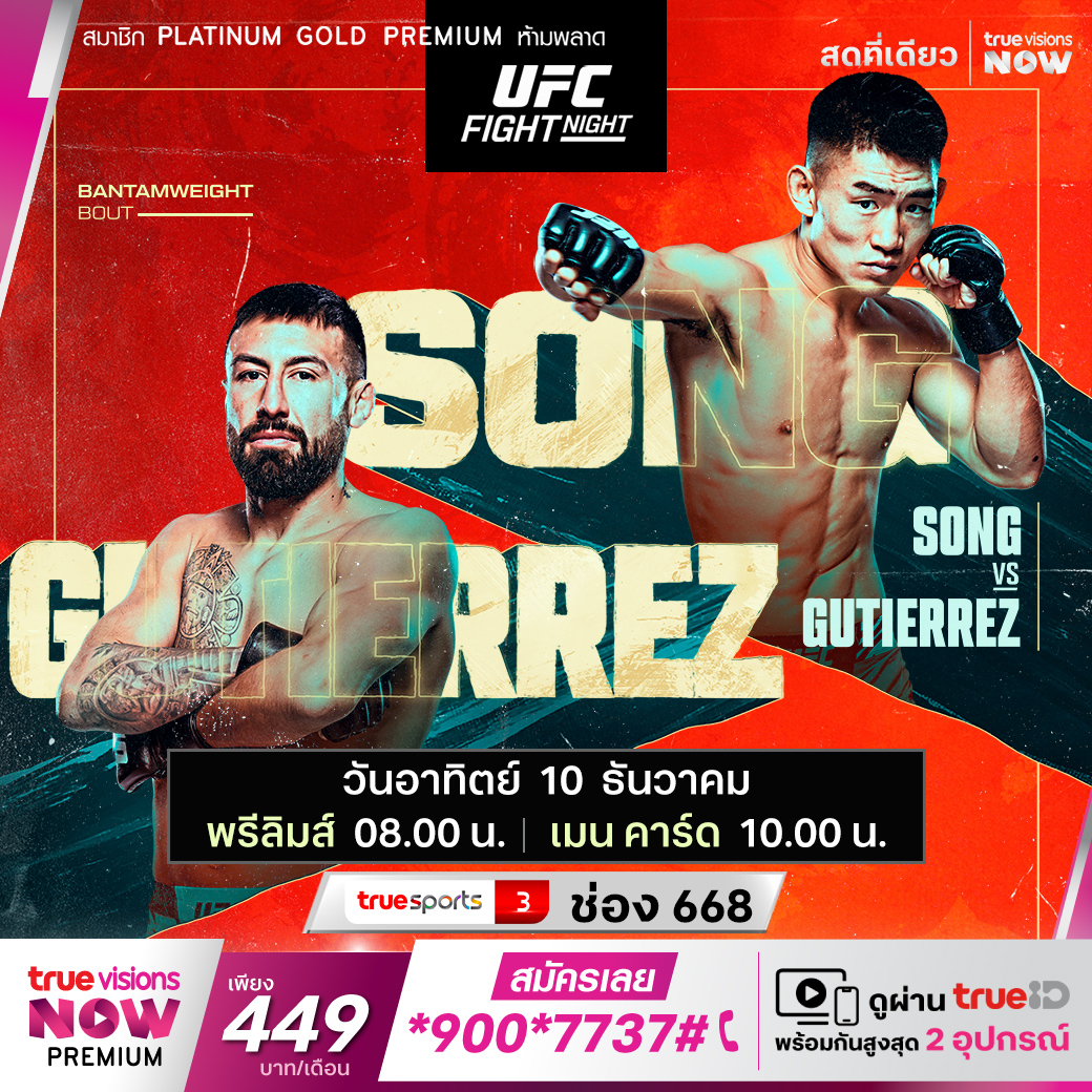 มันส์ทะลุกรงเหล็กกันต่อเนื่องกับ ยูเอฟซี ไฟต์ ไนท์ จากสังเวียน ยูเอฟซี เอเพ็กซ์ ลาส เวกัส สหรัฐอเมริกา สัปดาห์นี้ คู่เอก จอมดีเดือดจากจีน สง หย่าตง รองแชมป์ อันดับ 7 รุ่นแบนตั้มเวต ปะทะฝีมือกับ คริส กูเตียร์เรซ นักบู๊ชาวอเมริกัน ร่วมด้วย แอนโทนี่ สมิธ รองแชมป์อันดับ 8 รุ่นไลต์เฮฟวี่เวต ท้าชน คาลิล ราวน์ทรี จูเนียร์ สดครบ จุใจ ทั้งช่วง พรีลิมส์ และ เมน คาร์ด ชมสด ทางทรูวิชั่นส์ ที่เดียว