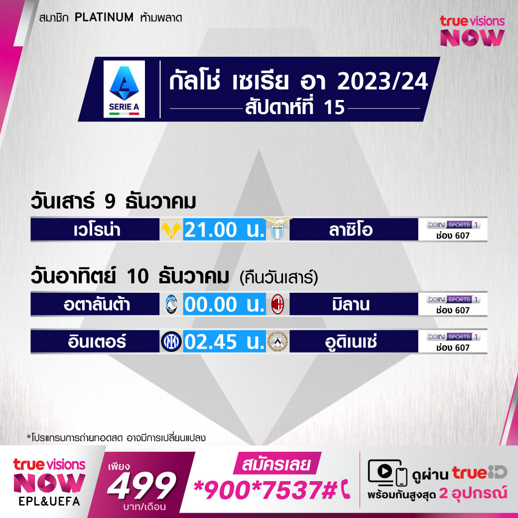 Inter vs Udinese เวลา 02.45-04.45 ทางช่อง beIN 1 (607)