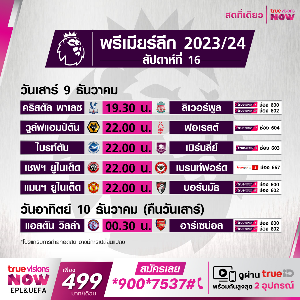 วันนี้มีอะไรดูที่ ทรูวิชั่นส์ ประจำวันเสาร์ที่ 9 ธันวาคม 66 ในส่วนของฟุตบอลยังมีศึกพรีเมียร์ลีก อังกฤษ, กัลโช่ เซเรีย อา อิตาลี, บุนเดสลีกา เยอรมนี, ลา ลีกา สเปน และ ลีก เอิง ฝรั่งเศส ให้ได้ตามเชียร์กันต่อ ส่วนกีฬาอื่นๆ ยังมีศึกกอล์ฟรายการพิเศษ แกรนต์ ธอร์นตัน อินวิเตชั่นแนล, เวิลด์ สนุกเกอร์ ชู๊ตเอาท์ 2023 และศึกยูเอฟซี ไฟต์ ไนท์ งานนี้ ทรูวิชั่นส์ จัดเต็มให้ชมกันถึงบ้าน