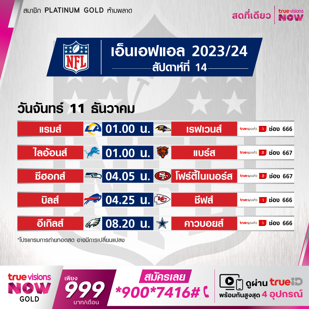 วันจันทร์ 11 ธ.ค. Bills Vs Chiefs เวลา 04.25 ทางช่อง TS 1 (666)