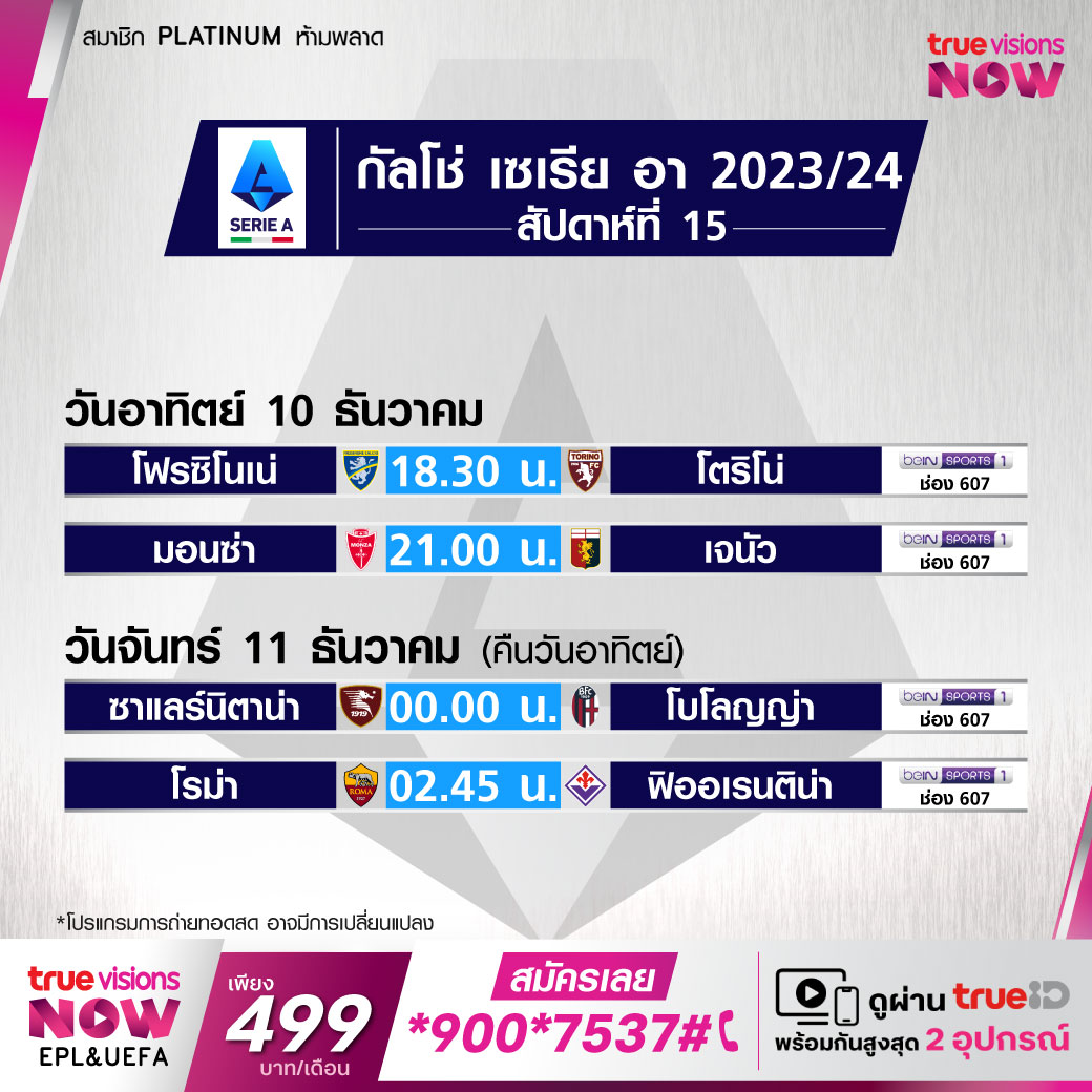 Monza vs Genoa เวลา21.00-23.00 ทางช่อง beIN 1 (607)