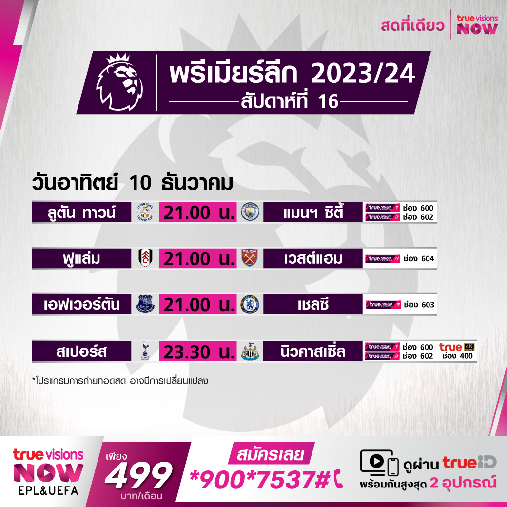 วันนี้มีอะไรดูที่ ทรูวิชั่นส์ ประจำวันอาทิตย์ที่ 10 ธันวาคม 66 ในส่วนของฟุตบอลยังมีศึกพรีเมียร์ลีก อังกฤษ, กัลโช่ เซเรีย อา อิตาลี, บุนเดสลีกา เยอรมนี, ลา ลีกา สเปน และ ลีก เอิง ฝรั่งเศส ให้ได้ตามเชียร์กันต่อ ส่วนกีฬาอื่นๆ ยังมีศึกกอล์ฟรายการพิเศษ แกรนต์ ธอร์นตัน อินวิเตชั่นแนล และศึกอเมริกันฟุตบอลเอ็นเอฟแอล งานนี้ ทรูวิชั่นส์ จัดเต็มให้ชมกันถึงบ้าน