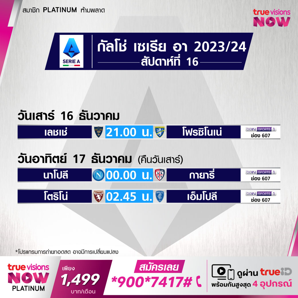 วันนี้มีอะไรดูที่ ทรูวิชั่นส์ ประจำวันเสาร์ที่ 16 ธันวาคม 66 ในส่วนของฟุตบอลยังมีศึกพรีเมียร์ลีก อังกฤษ, กัลโช่ เซเรีย อา อิตาลี, บุนเดสลีกา เยอรมนี, ลา ลีกา สเปน และ ลีก เอิง ฝรั่งเศส ให้ได้ตามเชียร์กันต่อ ส่วนกีฬาอื่นๆ ยังมีกอล์ฟรายการพีเอ็นซี แชมเปี้ยนชิพ, เอเชียนทัวร์ รายการ ซาอุดิ โอเพ่น, ศึกแบดมินตัน บีดับเบิ้ลยูเอฟ รายการ เวิลด์ ทัวร์ ไฟนอลส์, ศึกเวิลด์ สนุกเกอร์ รายการ สกอตติช โอเพ่น, ศึกยูเอฟซี 296, ศึกอเมริกันฟุตบอลเอ็นเอฟแอล และศึกบาสเกตบอลเอ็นบีเอ งานนี้ ทรูวิชั่นส์ จัดเต็มให้ชมกันถึงบ้าน